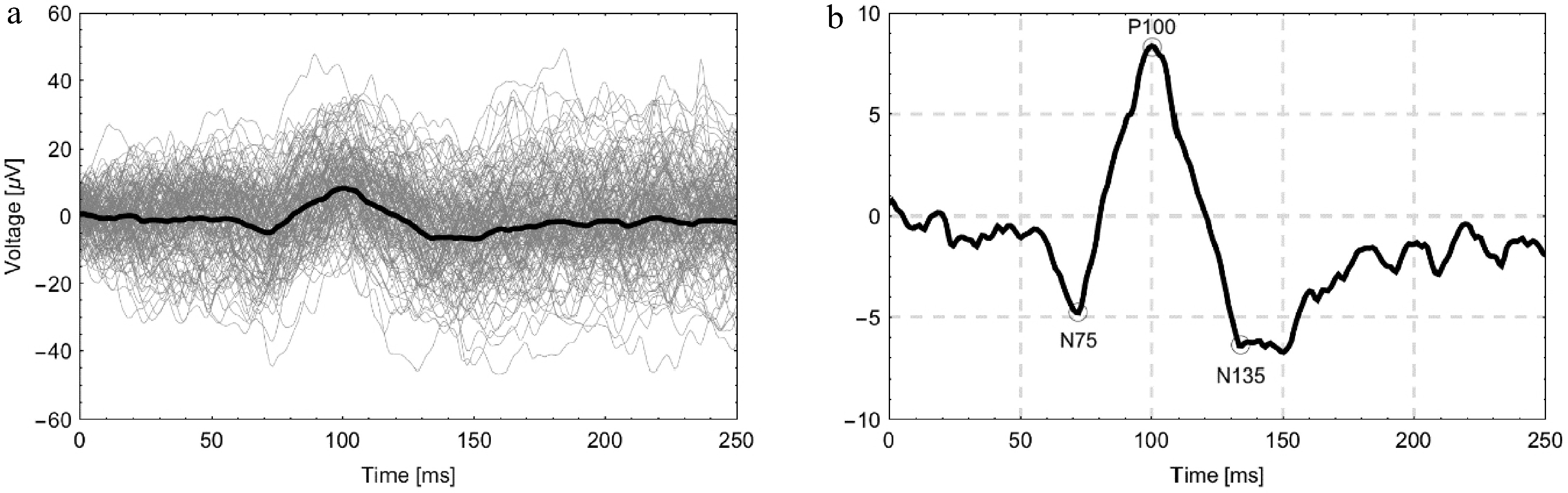 (a) Illustrative graph of VEP signals from the right eye of a healthy male volunteer showing 80 individual trials (gray) along with the averaged signal (bold dark line). (b) The same averaged signal is shown on an enlarged scale with the characteristic components N75, P100, and N135 indicated.