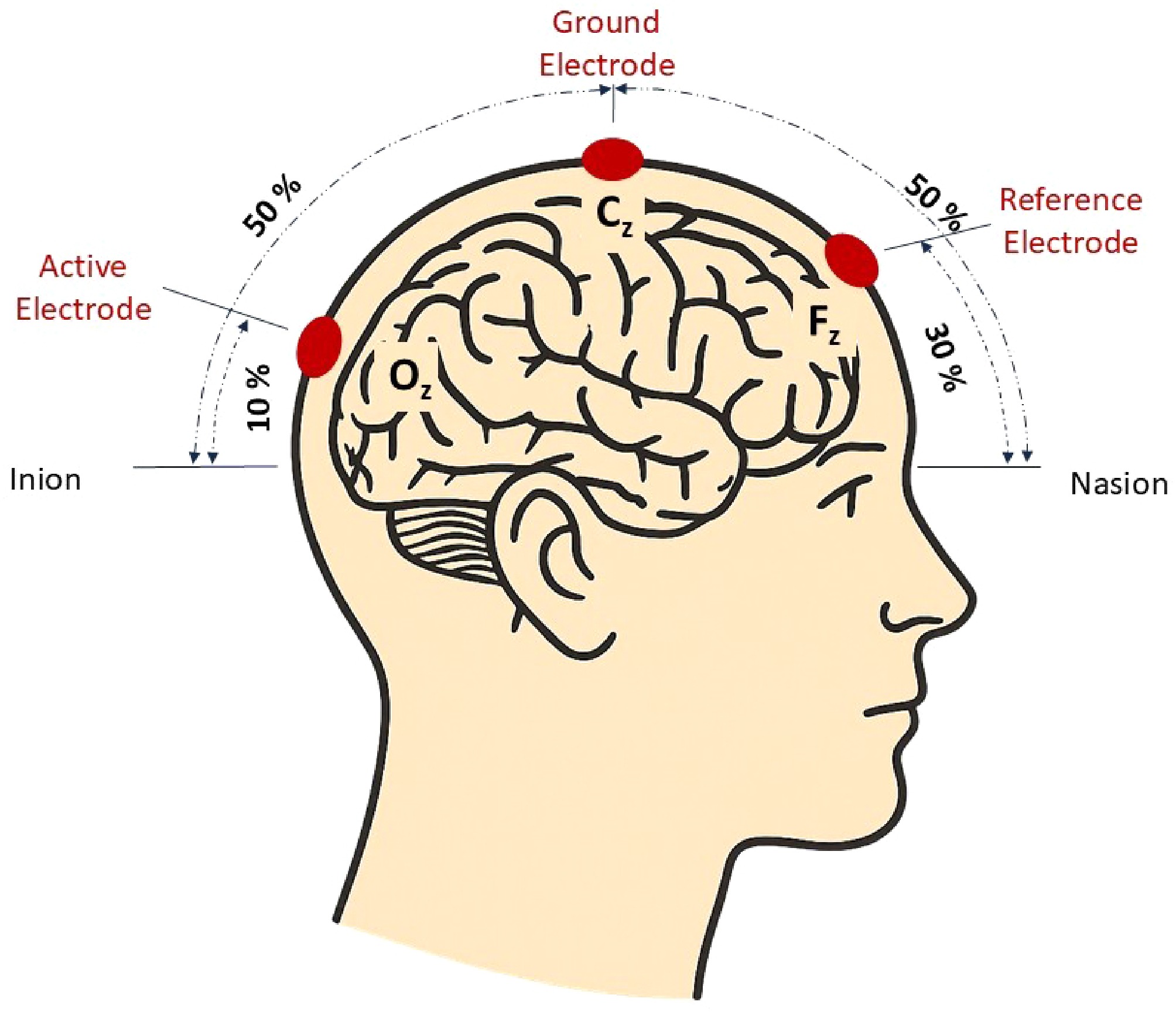 Diagram of the electrode placement along the midline of the scalp used in visual evoked potential examination. (Original illustration by the authors).
