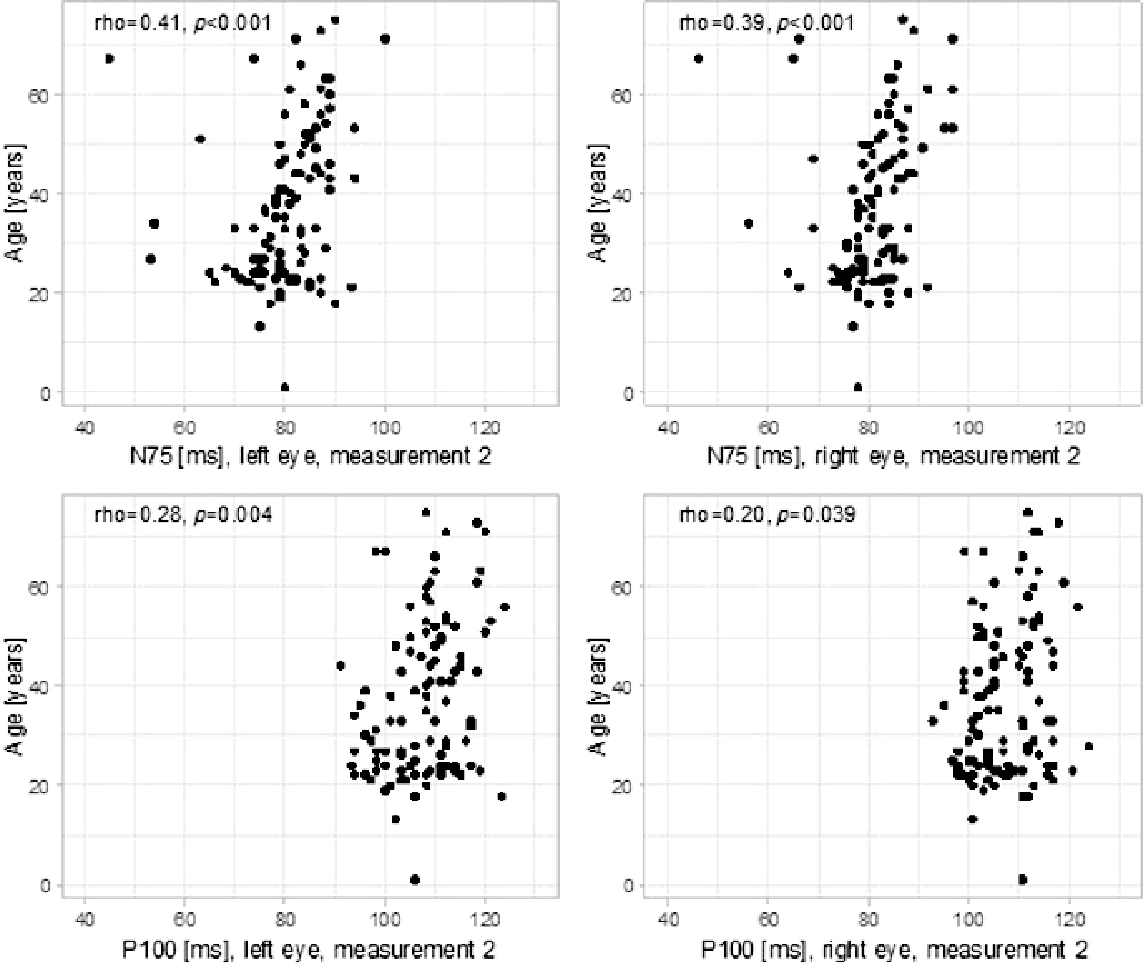 A moderate-strength positive correlation was confirmed between age and N75 [ms] in both eyes in measurement 2 (left eye: rho = 0.41, p < 0.001, right eye: rho = 0.39, p < 0.001).