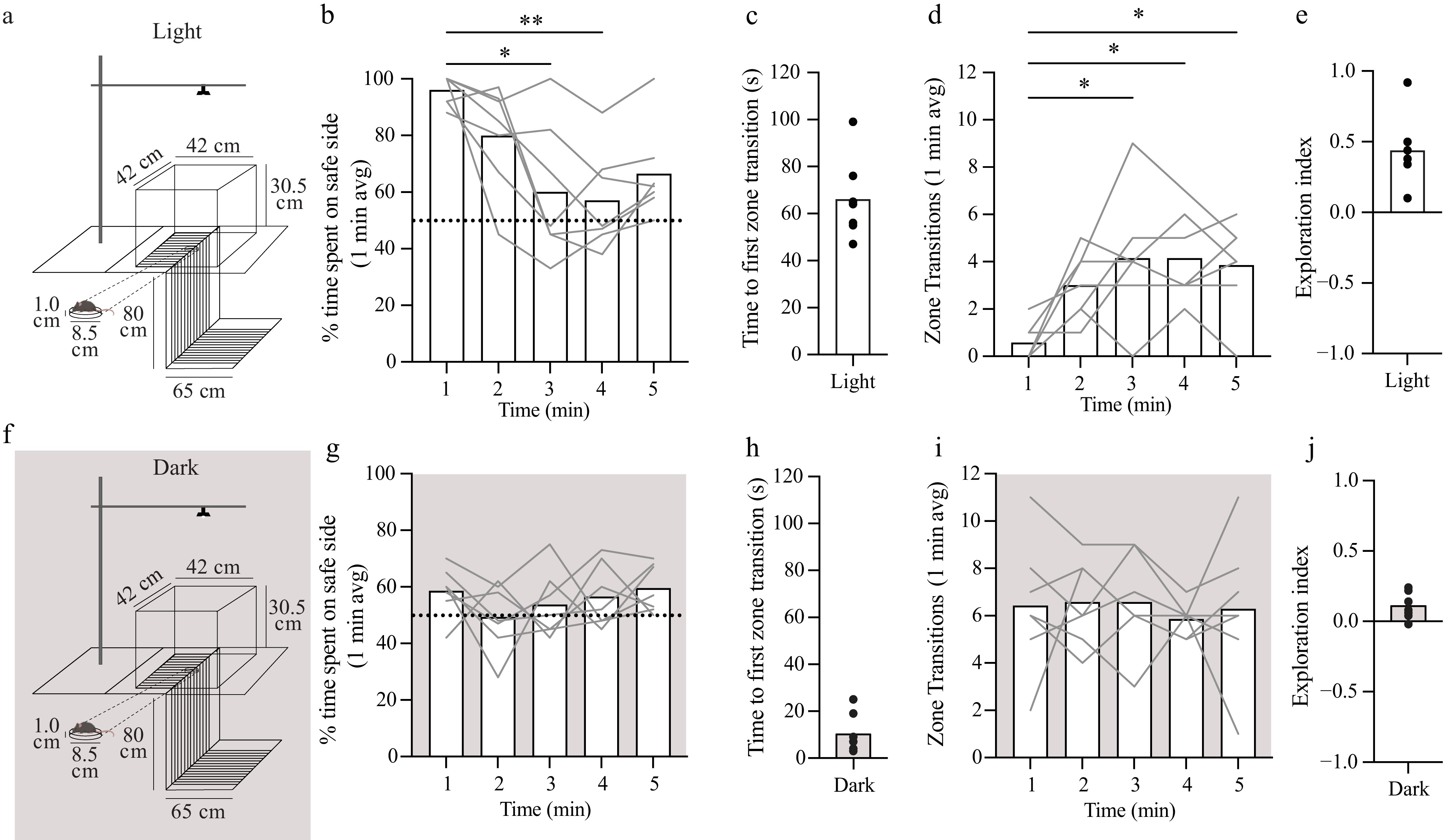 • To characterize the VCA, we first quantified the inherent tendency of mice to stay on the safe side under normal lighting conditions. Female and male mice (P45–58, n = 7) were placed on the middle of the apparatus (Fig. 1a) facing the safe side and allowed to freely explore the arena for 5 min as previously described[28,30]. Sessions were video-recorded from above, and the behaviors were scored as the percentage of time spent on the safe side per minute (Fig. 1b), the time to the first zone transition (Fig. 1c), and the number of transitions between zones per minute (Fig. 1d). Performance did not differ between female and male mice, so data from both sexes were combined for all analyses. On average, animals spent 96.0% ± 4.8% (95% confidence interval [CI]) of the first minute on the safe side. A nonparametric repeated Friedman test showed the main effect of test time on the proportion of time spent on the safe side over the 5-min test (p = 0.0060). Pairwise comparisons revealed that time spent on the safe side decreased significantly to 60.0% ± 22.2% (∆ = 37.5%; p = 0.0162) and 57.0% ± 22.2% (∆ = 40.6%; p = 0.0021) during the third and fourth min, respectively (Fig. 1b). On average, animals made the first zone transition to the cliff side at 66.0 ± 15.9 s (Fig. 1c). The repeated Friedman test showed a main effect of test time on the number of zone transitions (p = 0.0088). We observed a significant increase in the number of zone transitions by the third (first min: 0.6 ± 0.7, third min: 4.1 ± 2.5; p = 0.0211), fourth (4.1 ± 1.7; p = 0.0162), and fifth min (3.9 ± 1.8; p = 0.0211) (Fig. 1d). The exploration index (EI), a standard single measure of VCA performance[31,32], was 0.44 ± 0.23 (Fig. 1e).