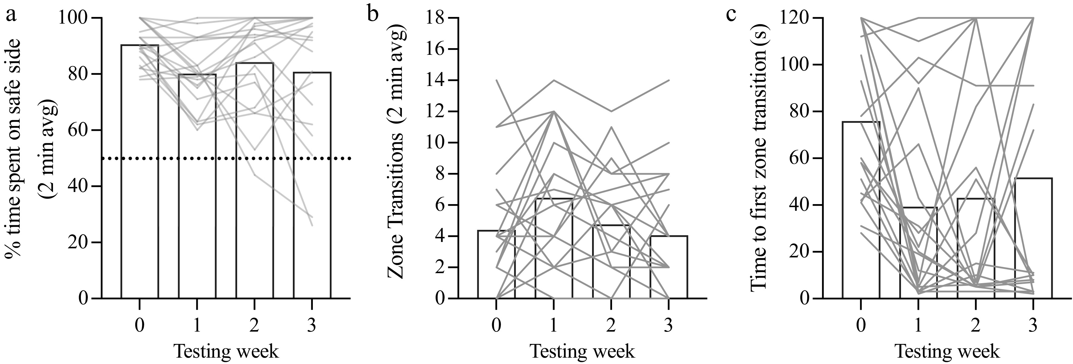 Test–retest stability of VCA performance. (a) Percentage of time spent on the safe side (average over each 2-min trial) plotted as a function of testing week (1-week trial interval). The dotted line (y = 50%) represents chance performance. (b) Time to the first zone transition from the safe to cliff side plotted as a function of testing week. (c) The total number of transitions between zones plotted as a function of testing week. Mean values are represented as bars for each test week. Individual animals are represented as gray lines. Dunn's multiple comparison indicates statistical significance compared with Week 0: * < 0.05.