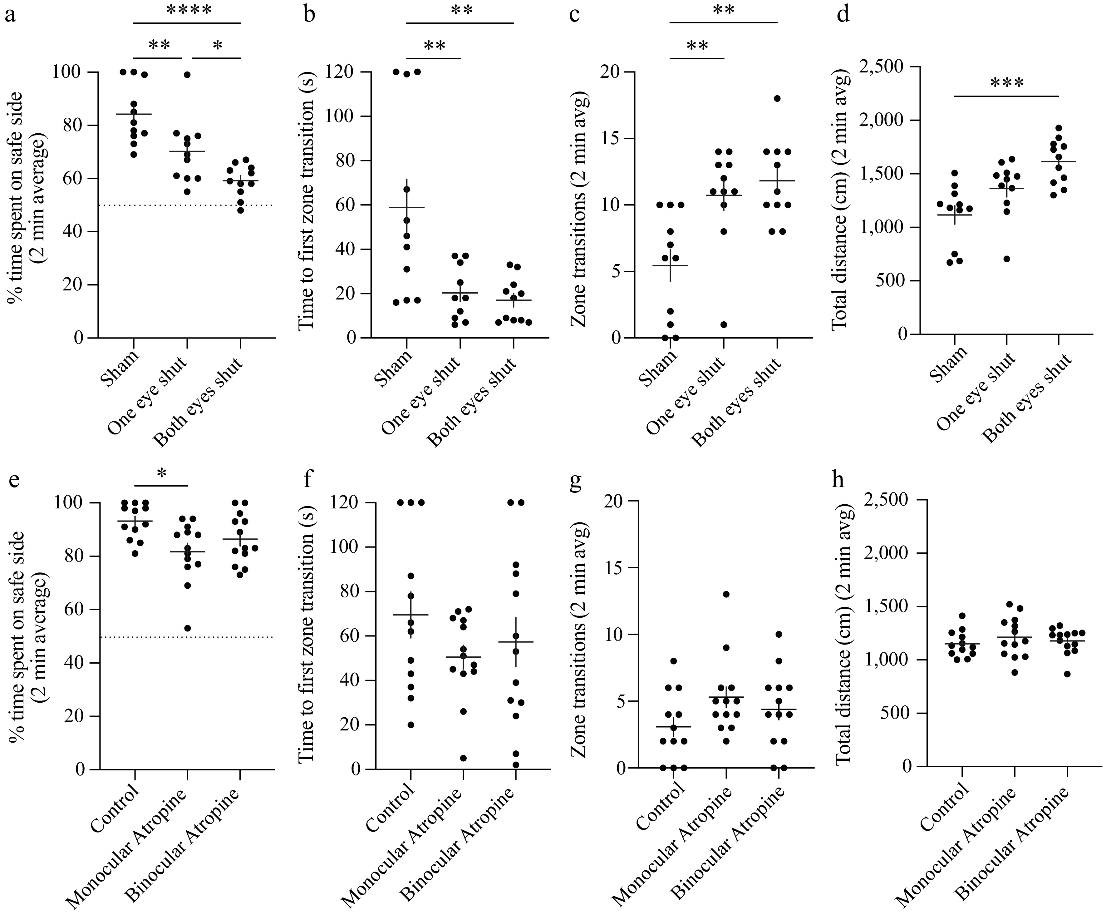 Disruptions of binocularity impair VCA performance. (a)–(d) Animals performed the 2-min VCA with neither (sham), one, or both eyes sutured shut. (a) Percentage of time spent on the safe side plotted for each eye closure group. The dotted line (y = 50%) represents chance performance. (b) Time to the first zone transition from the safe to cliff side plotted for each eye closure group. (c) The total number of transitions between zones plotted for each eye closure group. (d) Total distance traveled during the test plotted for each eye closure group. (e)–(h) Animals performed the 2-min VCA after neither unilateral or bilateral pupillary dilation via administration of atropine eye drops. (e) Percentage of time spent on the safe side plotted for each atropine group. The dotted line (y = 50%) represents chance performance. (f) Time to the first zone transition from the safe to cliff side plotted for each atropine group. (g) The total number of transitions between zones plotted for each atropine group. (h) Total distance traveled during the test plotted for each atropine group. Individual animals are represented as circles, and the mean ± standard error of the mean (SEM) as black horizontal and vertical lines. Dunn's multiple comparison indicates statistical significance between groups: * < 0.05, ** < 0.01, *** < 0.001, **** < 0.0001.