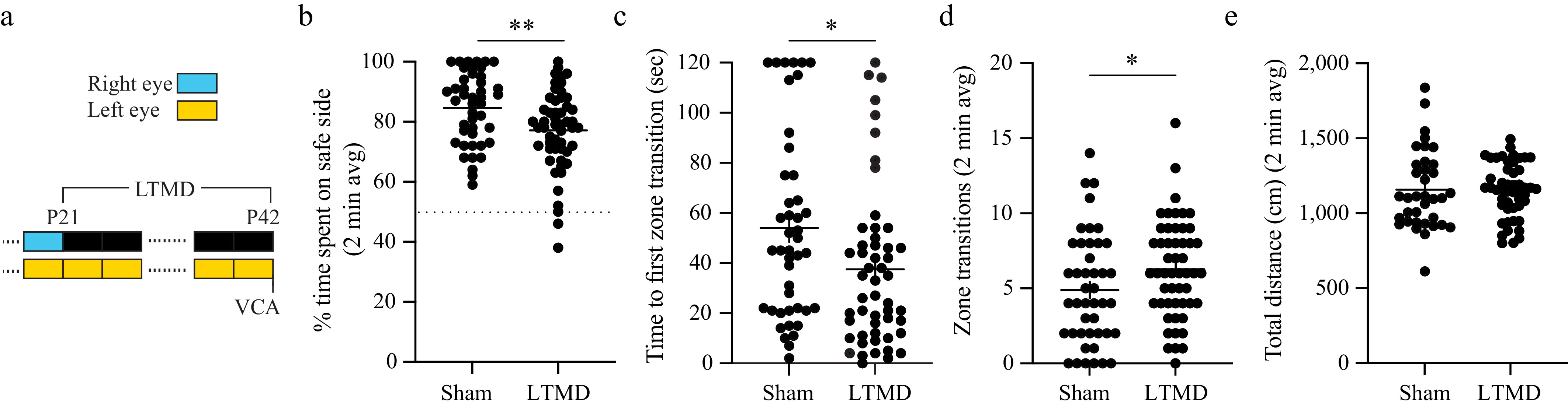 • We next tested the effects of amblyogenic rearing. Female and male mice underwent 3 weeks of LTMD or sham eyelid closure/opening from P21 to P42 and were tested on the VCA 1–3 h after eye opening (Fig. 4a). To ensure the study was adequately powered to detect meaningful group differences, an interim power analysis was performed after testing the first cohort of the sham control (n = 14) and LTMD (n = 14) animals. According to this analysis, with a Type I error rate set at 5% (two-sided) and a desired power of 80%, a sample size of 44 animals per group was determined. Amblyopic mice (sham control, n = 44; LTMD, n = 52) showed impaired performance across all VCA metrics (Fig. 4bd). LTMD decreased time spent on the safe side by 7.5% compared with the control animals (p = 0.0070) (Fig. 4b). LTMD decreased the time to the first zone transition by 16.5 s (20.6%) (p = 0.0243) (Fig. 4c) and increased the number of zone transitions (p = 0.0393) (Fig. 4d), but there were no differences between sham and LTMD mice in the routes taken when transitioning from the safe to the cliff side (Supplementary Fig. S1). LTMD had no effect on total distance traveled (p = 0.6218) (Fig. 4e), suggesting that amblyopia does not increase ambulatory movement the way occlusion does. Together, these data demonstrate that LTMD imparts an amblyopic deficit in binocular function in mice, to which multiple VCA metrics are sensitive.