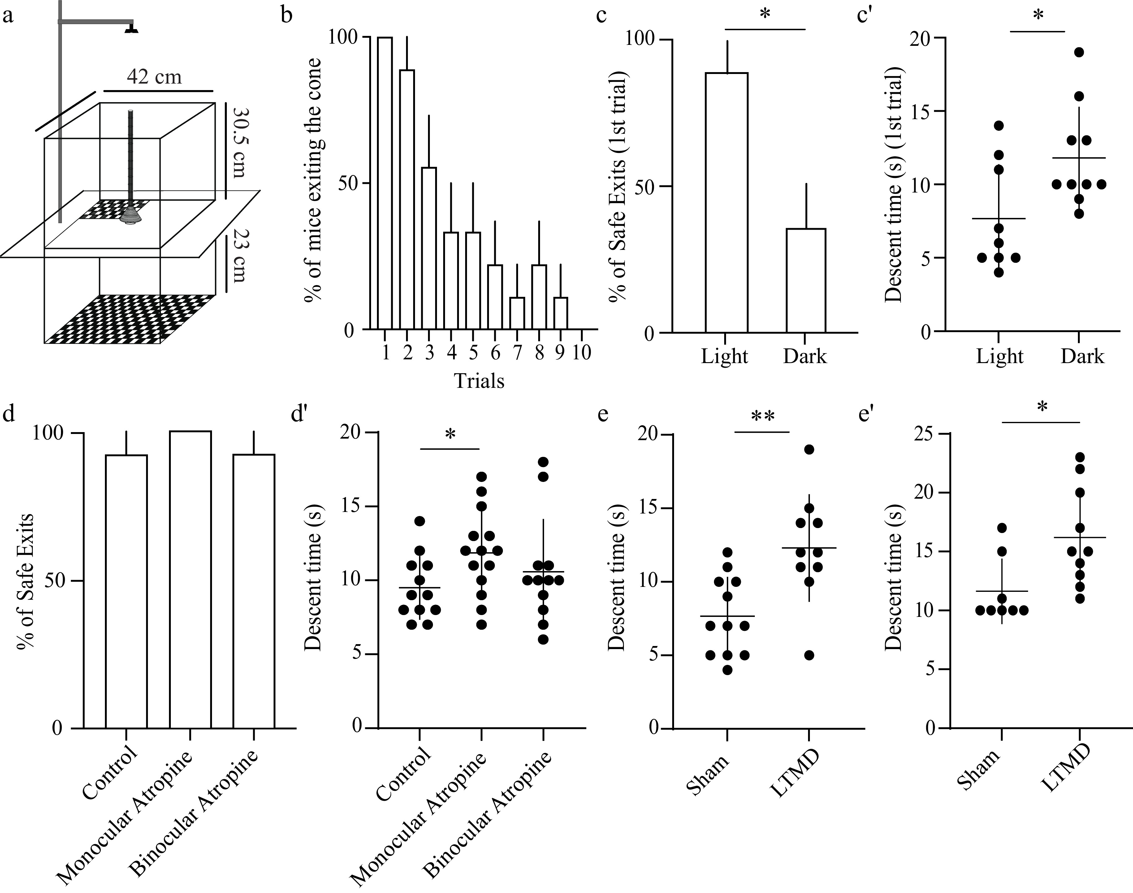 Disruptions of binocularity and LTMD impair descent time in the PDCT. (a) Graphical design of the PDCT apparatus with measurements that were used. Mice descend a pole positioned above a cone (9 cm in diameter) placed on a glass plate. One quadrant is positioned 1.5 cm below the cone; the remaining three are 24.5 cm below the cone. All quadrants are covered with black and white checkerboard. (b) Percentage of mice that exit the pole and cone onto any quadrant across 10 interleaved trials, each lasting 3 min. Dunnett's multiple comparisons testing relative to Trial 1 revealed p < 0.05 or less for Trials 4–10. (c) Percentage of safe exits (exit to the quadrant 1.5 cm below the cone) under normal lighting conditions and in complete darkness. (c') Descent time (the time taken to descend the pole) under normal lighting conditions and in complete darkness. (d) Percentage of safe exits of animals after neither unilateral nor bilateral pupillary dilation via administration of atropine ointment. (d') Descent time plotted for each atropine group. (e) Descent time plotted for the sham and LTMD animals. (e') Independent replication of LTMD's effects on descent time using the modified configuration. Bar graphs: mean ± SEM; scatter plots: mean ± SD. Individual animals are represented as circles. Unpaired t-test between groups: * p < 0.05, ** p < 0.01.