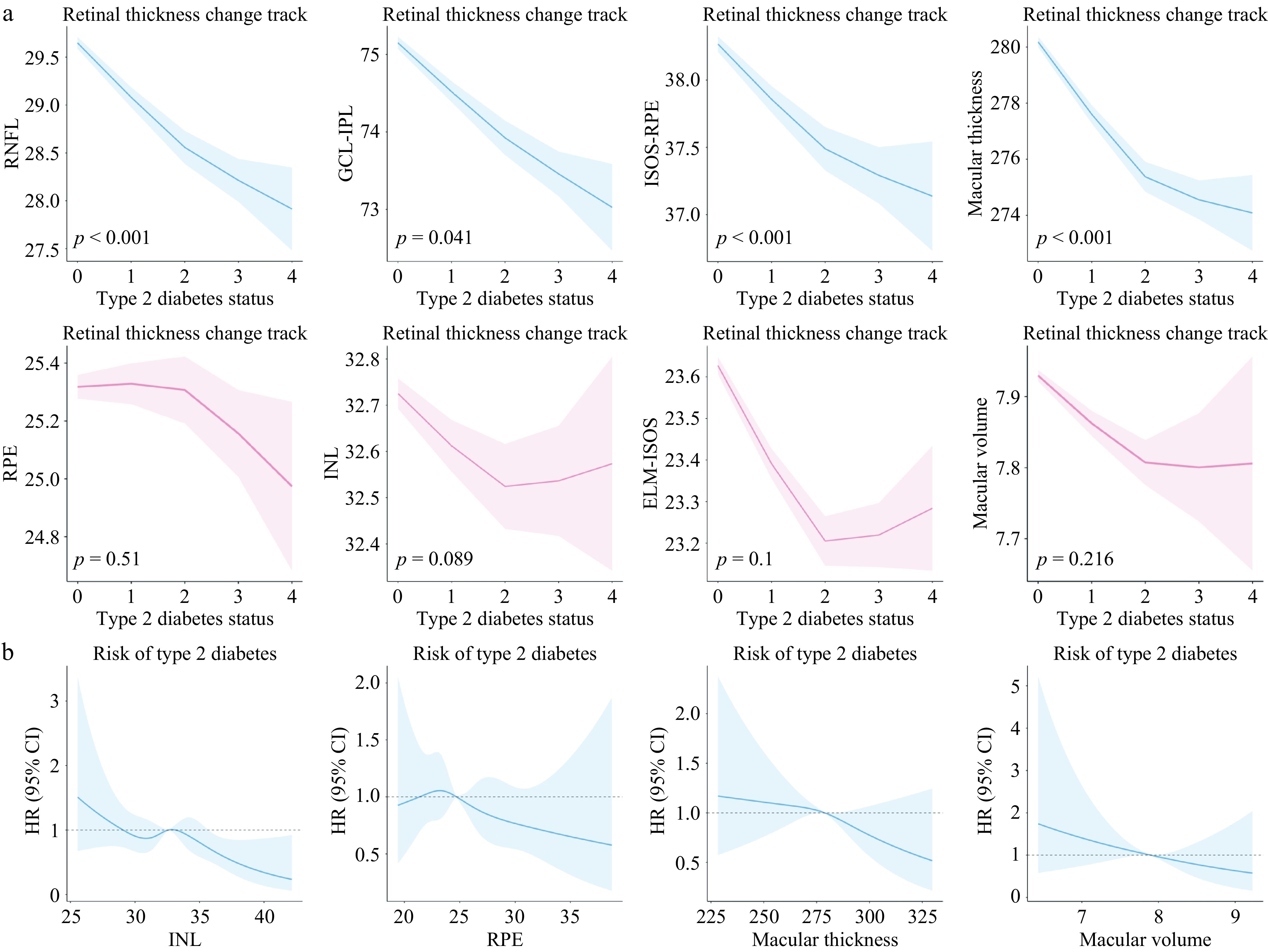 • In conclusion, certain retinal sublayer thicknesses can serve as sensitive indicators and biomarkers reflecting the development of T2D. Changes in retinal sublayer thickness occur during the preclinical stage of diabetes, showing a graded association with the severity of the disease, and are significantly correlated with the risk of diabetes onset. Future research needs to explore the underlying mechanisms related to changes in retinal thickness in diabetic patients, which could provide a new basis for the early prevention and treatment of T2D.
