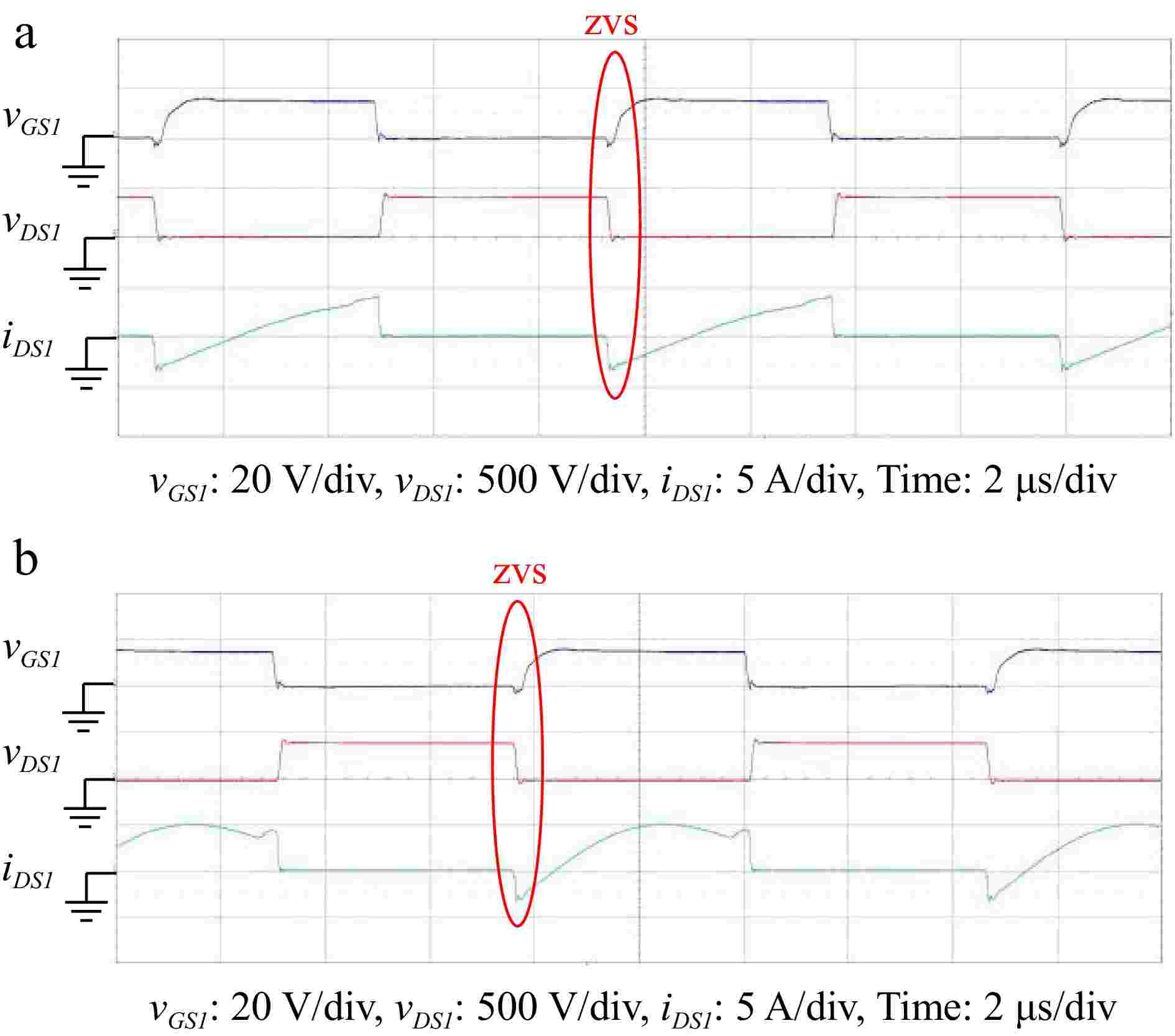 This converter operates in forward charging CV mode with input voltage VDC_Grid is 400V, output voltage VBat is 400 V, output current is 0.25 to 2.5 A. Figure 22 show the vGS1, vDS1 and iDS1 waveforms of the power switch Q1. It can be seen from the waveforms that when the switch voltage vDS1 is 0 V, and the iDS1 current is in a countercurrent state. This current releases the parasitic capacitance stored energy on the power switch, causing the power switch Q1 to have zero overvoltage and the current to continue through the body diode of the power switch Q1, thus achieving the ZVS function.