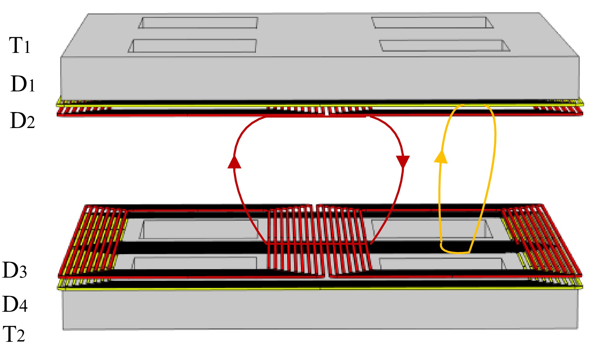 By leveraging their orthogonal characteristics, when two DD coils are arranged perpendicularly with orthogonal alignment, their magnetic field lines remain mutually perpendicular, thereby exhibiting no mutual interference. As illustrated in Fig. 1, the red and yellow DD coils demonstrate this vertical orthogonal configuration, with their respective magnetic flux lines maintaining strict perpendicularity. The four DD coils are labeled sequentially from top to bottom as D1, D2, D3, and D4, with T1 and T2 denoting the primary and secondary magnetic cores, respectively. Due to the non-interfering nature of their magnetic fields, each coil pair demonstrates selective coupling: the D1 coil couples exclusively with the D4 coil, while the D2 coil interacts solely with the D3 coil.