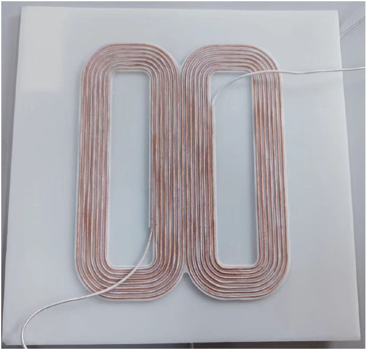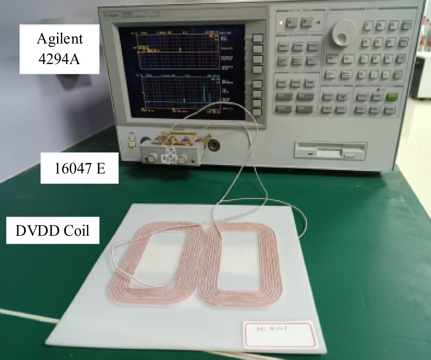 • Based on the size parameters of the DVDD magnetic coupling mechanism given in Table 1, the DVDD coil was fabricated using Litz wire of different specifications, tightly wound onto a 2 mm thick 3D-printed resin groove board. The completed DVDD coil to be tested is shown in Fig. 9. An inductance parameter testing experimental platform was also set up, as shown in Fig. 10, where the impedance analyzer used is the Agilent 4294A, and the test fixture is the 16047E.