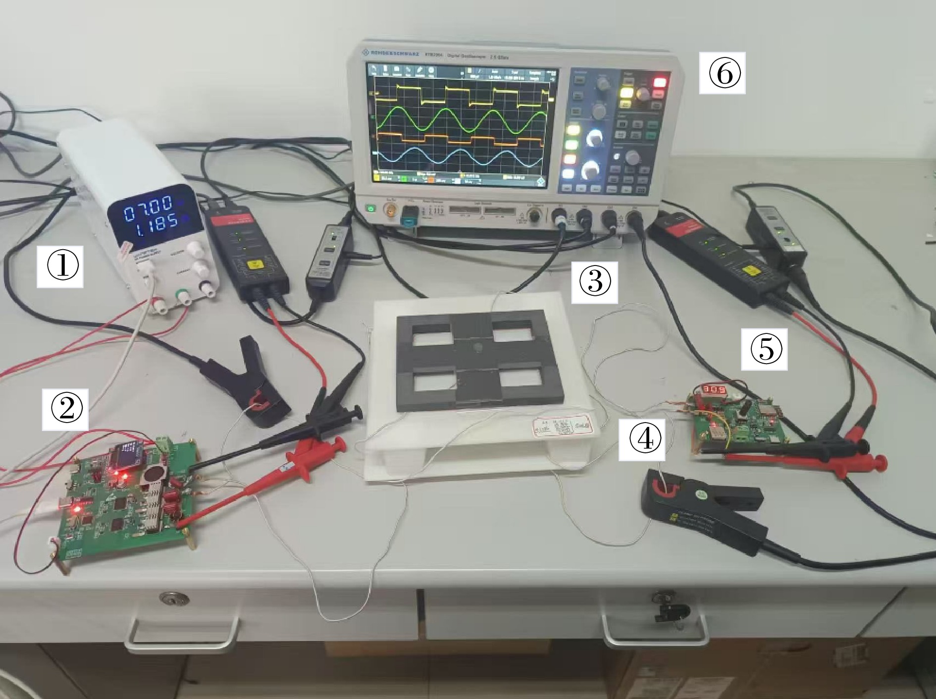 The experimental prototype of the WPT system using the DVDD magnetic coupling mechanism is shown in Fig. 11. The labels in the figure correspond to the following components: ① DC power supply; ② Primary circuit of the wireless power transfer system; ③ Primary coil of the DVDD magnetic coupling mechanism; ④ Secondary coil of the DVDD magnetic coupling mechanism; ⑤ Secondary circuit of the wireless power transfer system; ⑥ Oscilloscope (Model: RTB 2004). In this setup, both the transmitting and receiving coils of the DVDD magnetic coupling mechanism are wound with 0.1 mm × 120 strands of Litz wire, with each D-shaped coil consisting of eight turns. The coil magnetic core uses PC95-type power ferrite material.