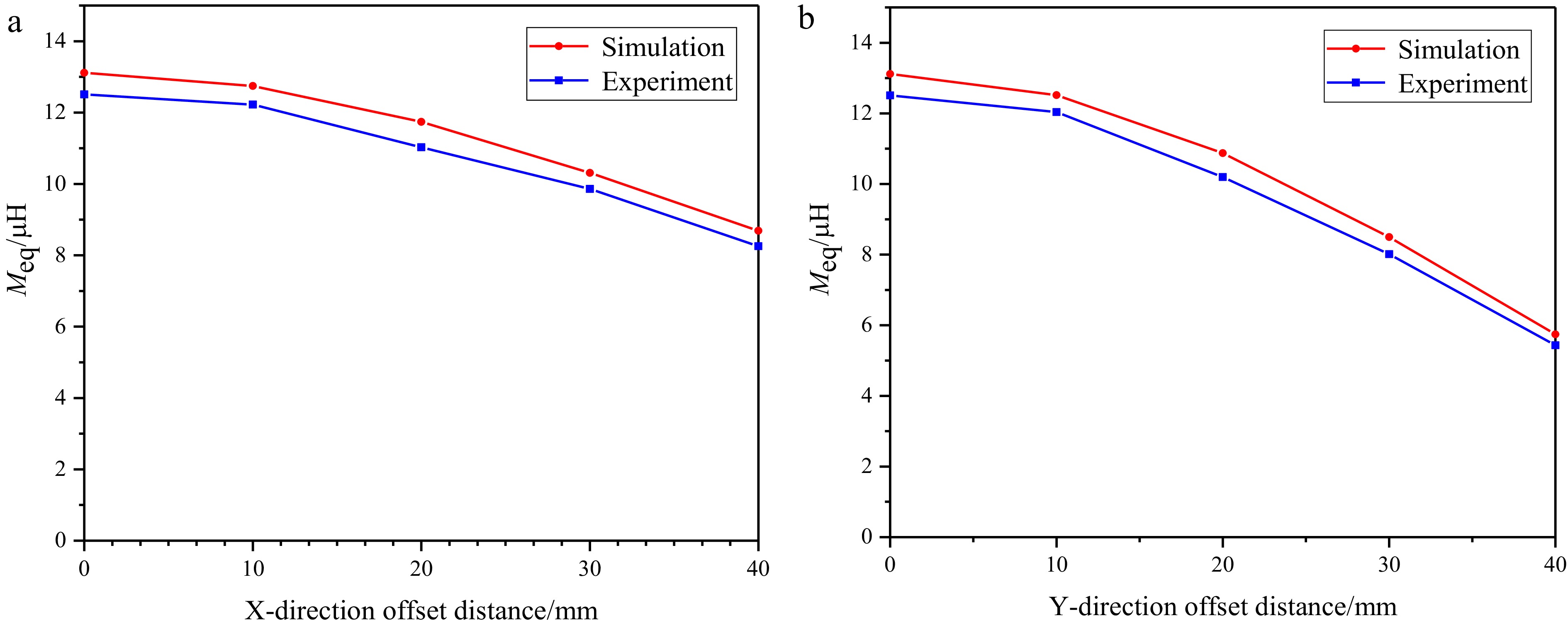Mutual inductance variation curve of DVDD magnetic coupling mechanism under X-axis and Y-axis direction misalignment. Mutual inductance change curve under (a) X-axis direction misalignment and (b) Y-axis direction misalignment.