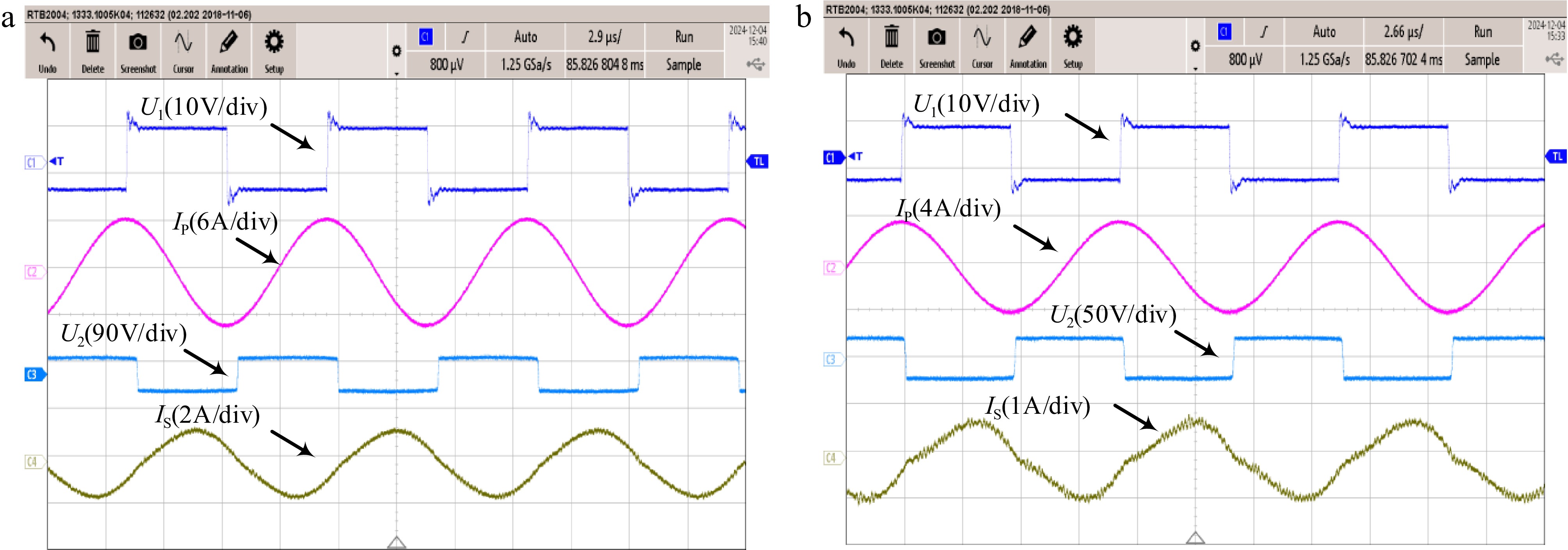 Experimental waveforms. Waveform diagram under (a) magnetic coupling alignment and (b) 4 cm misalignment of magnetic coupling mechanism.