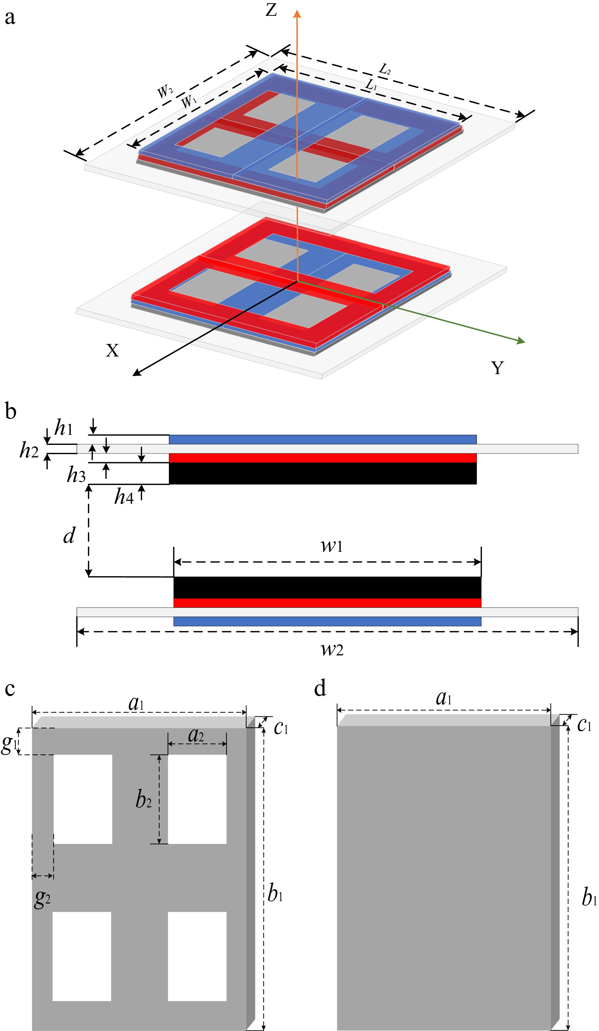 Figure 2c, d shows the schematic diagrams of the full-coverage magnetic core and the new-type magnetic core in the DVDD coil magnetic coupling mechanism. In Fig. 2c, the new-type magnetic core structure is designed in a cross shape to reduce the amount of magnetic core used while maintaining the magnetic field intensity at the center overlap position of the coils. Both the new-type magnetic core and the full-coverage magnetic core structure use PC95 ferrite, with identical length, width, and thickness, denoted as a1, b1, and c1, respectively. The internal rectangular length of the new-type magnetic core is a2, with a width of b2, and the distance from length a1 is g1, while the distance from width b2 is g2. The specific parameter values are provided in Table 1.