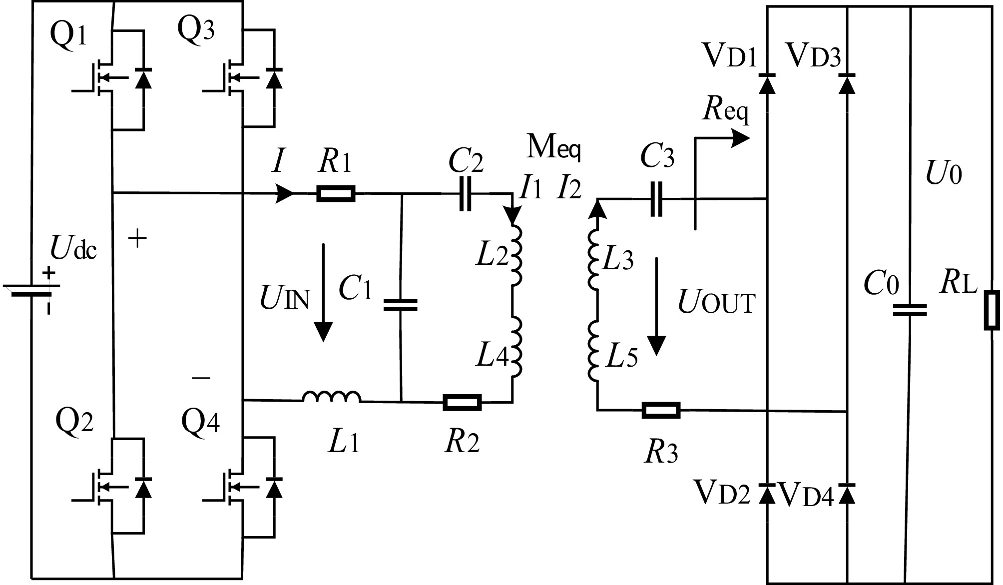 • As shown in Fig. 3, the wireless power transfer system using a dual-vertical DD coil magnetic coupling mechanism consists of six main parts: the DC power supply, primary full-bridge inverter circuit, LCC-S compensation network, primary and secondary coils, secondary bridge rectifier circuit, output filtering, and equivalent load resistance. The DC power supply is provided by Udc in Fig. 3. The primary full-bridge inverter circuit is composed of four MOSFETs labeled Q1 to Q4. The LCC-S compensation network consists of L1, R1, C1, C2, and C3, forming the resonant network. The primary and secondary coils each consist of a pair of double-layered, mutually perpendicular DD coils. L2, L3, L4, L5, R2, and R3 represent the self-inductance and resistance of the primary and secondary coils, respectively. Current I refers to the input current of the primary full-bridge inverter circuit, while currents I1 and I2 represent the currents flowing through the primary and secondary coils. The secondary bridge rectifier circuit is made up of four diodes (VD1 to VD4), and C0 is the output filtering capacitor of the rectifier circuit. UIN, UOUT, Udc, Meq, RL, and Req denote the input voltage of the primary-side coil, output voltage at the secondary-side coil, DC voltage, equivalent mutual inductance, load resistance, and equivalent load resistance on the secondary side, respectively.