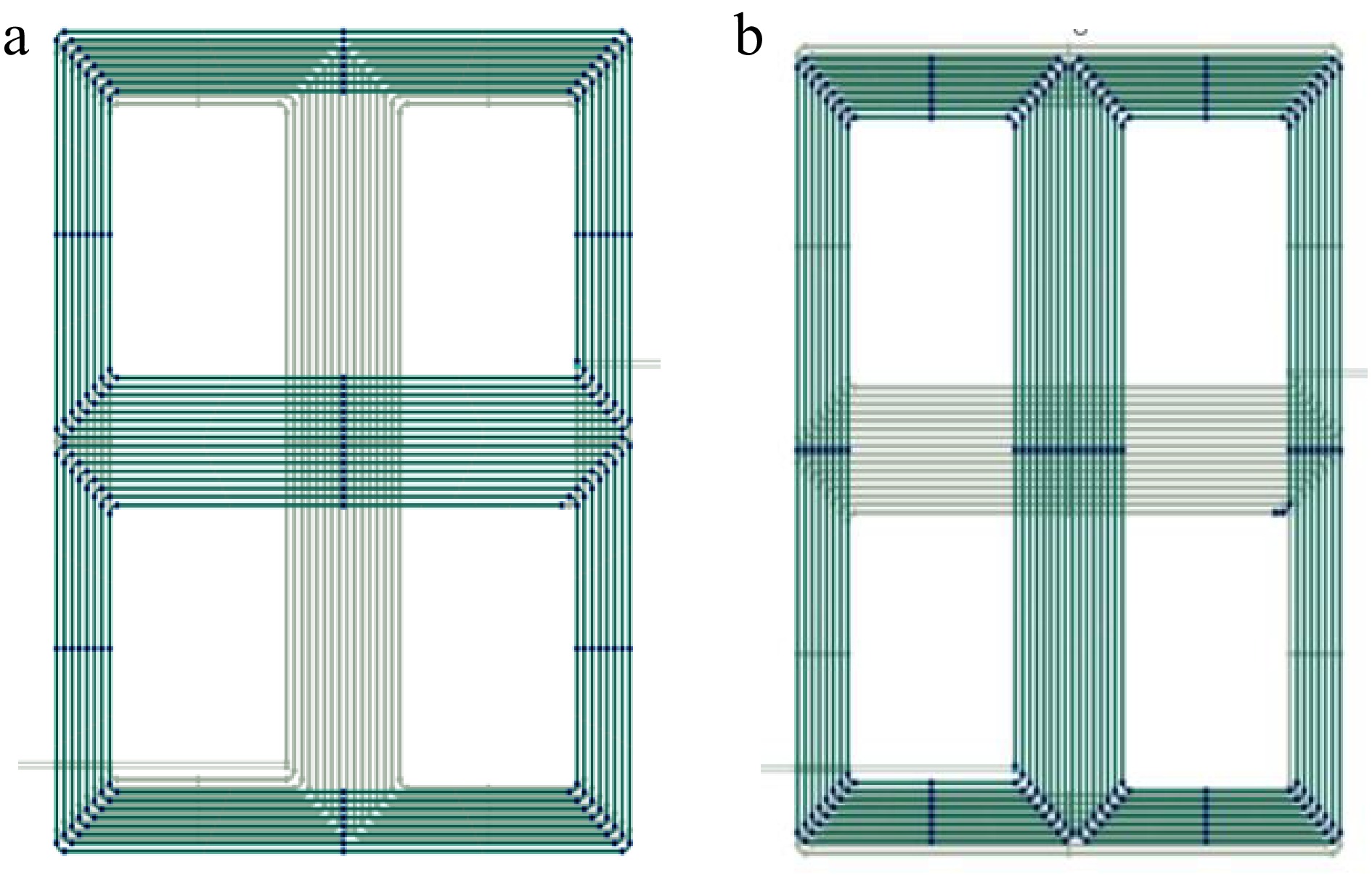 Currently, many scholars have proposed and implemented various techniques to improve the misalignment tolerance of magnetic coupling mechanisms. These techniques primarily focus on four aspects: control strategies, compensation topologies, mode switching, and magnetic coupler optimization, to enhance the misalignment resistance of load devices in WPT systems[9,10]. However, using control strategies, compensation topologies, and mode switching to improve the misalignment tolerance of magnetic coupling mechanisms often increases the complexity of WPT system control, which leads to a significant increase in the number of passive components in the system. This, in turn, results in higher system costs and larger overall sizes, potentially limiting the applicability of WPT systems. Therefore, this study focuses on optimizing the magnetic coupling mechanism to enhance the misalignment tolerance of WPT systems. Through structural refinement of the magnetic coupler, the system's misalignment tolerance capability is significantly improved in both X-axis and Y-axis directions. Earlier researchers describe an innovative coupling structure—the DD coil, which consists of two D-shaped coils wound in different directions, connected in series and placed side by side[11]. This structure effectively ensures that the majority of the magnetic flux forms a closed loop between the primary and secondary coils, thereby improving the system's coupling coefficient. Compared to circular coils of the same size, the DD coil generates a larger effective charging area. Previous researchers proposed a same-plane orthogonal double DD magnetic coupling mechanism based on QDQP and designed a corresponding LCC-S composite compensation network to stabilize the system output voltage when the magnetic coupling mechanism is misaligned[12]. Previous work presents a misalignment-resistant wireless power transfer system based on DQDD coils and builds a 1 kW prototype with a 120 mm spacing, verifying the misalignment-resistant characteristics of the magnetic coupling mechanism[13]. Other researchers propose a coil structure that adds a Q-shaped coil to the DD coil[14]. The added Q-shaped coil is orthogonal to the DD coil, forming a DDQ magnetic coupling mechanism that compensates for the inductive blind spots present during misalignment in the DD coil. A dual-layer DD coil, where all D-shaped coils are wound in reverse, effectively increasing the effective charging area of the wireless power transfer system[15]. Existing solutions face dual challenges of compromised misalignment tolerance in both X-axis and Y-axis directions, compounded by excessive weight of magnetic cores. Existing winding configurations for magnetic coupling mechanisms predominantly employ tight winding due to the manufacturing challenges associated with loose winding techniques. This tight-wound structure results in a magnetic flux density distribution characterized by intensified field concentrations at the peripheral regions and a discernible reduction in the central area. However, loose-wound coils exhibit inter-turn spacing that shifts magnetic flux density concentration toward the central region, resulting in a more spatially homogeneous distribution. This characteristic effectively compensates for the central flux density deficiency observed in tight-wound coil configurations[16].