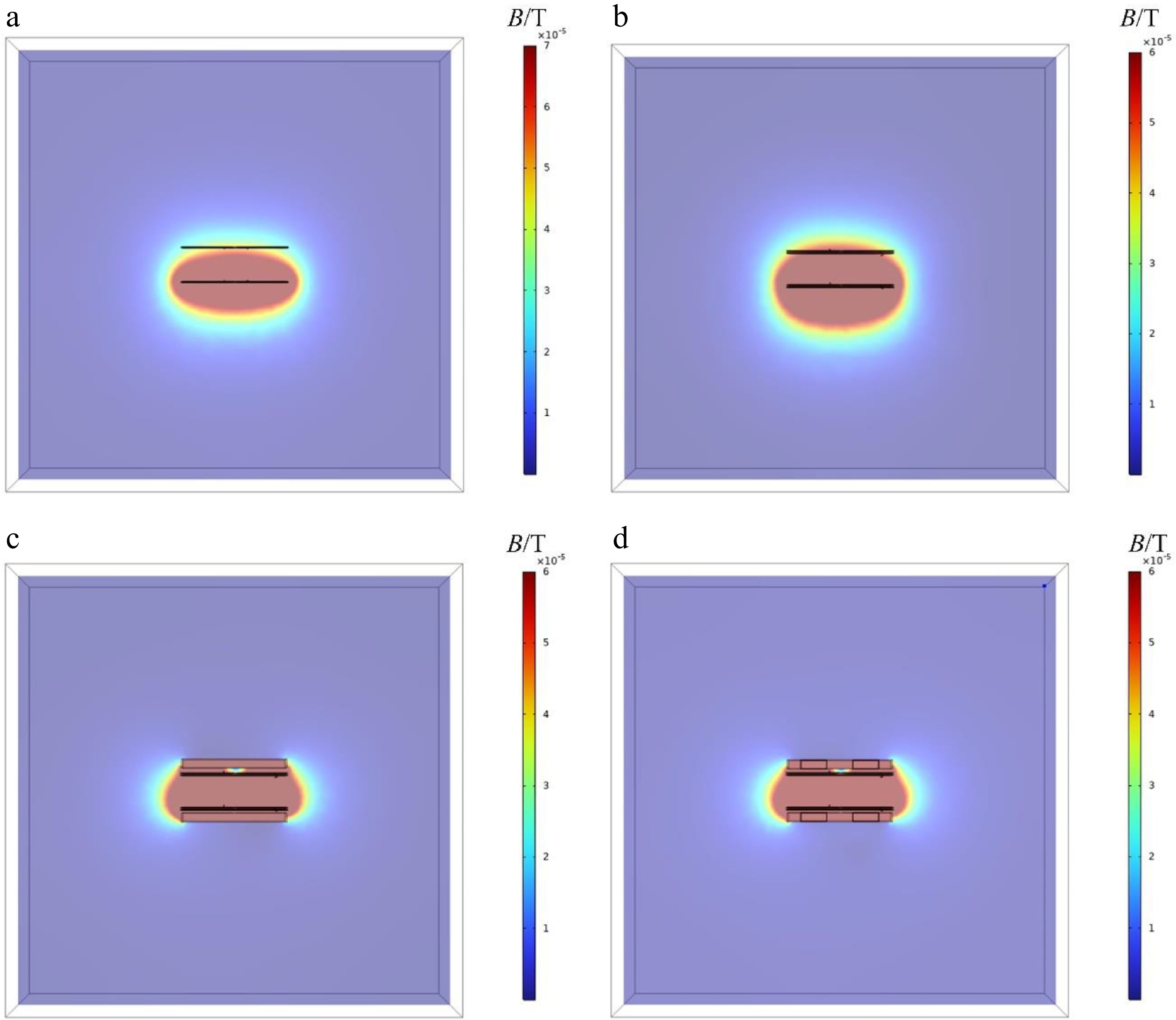 Magnetic field contour plots of the XZ cross-section of the magnetic coupling mechanism under four scenarios. (a) Single DD magnetic coupling mechanism without magnetic core. DVDD magnetic coupling mechanism (b) without magnetic core, (c) with full-cover magnetic core, and (d) with new-type magnetic core.
