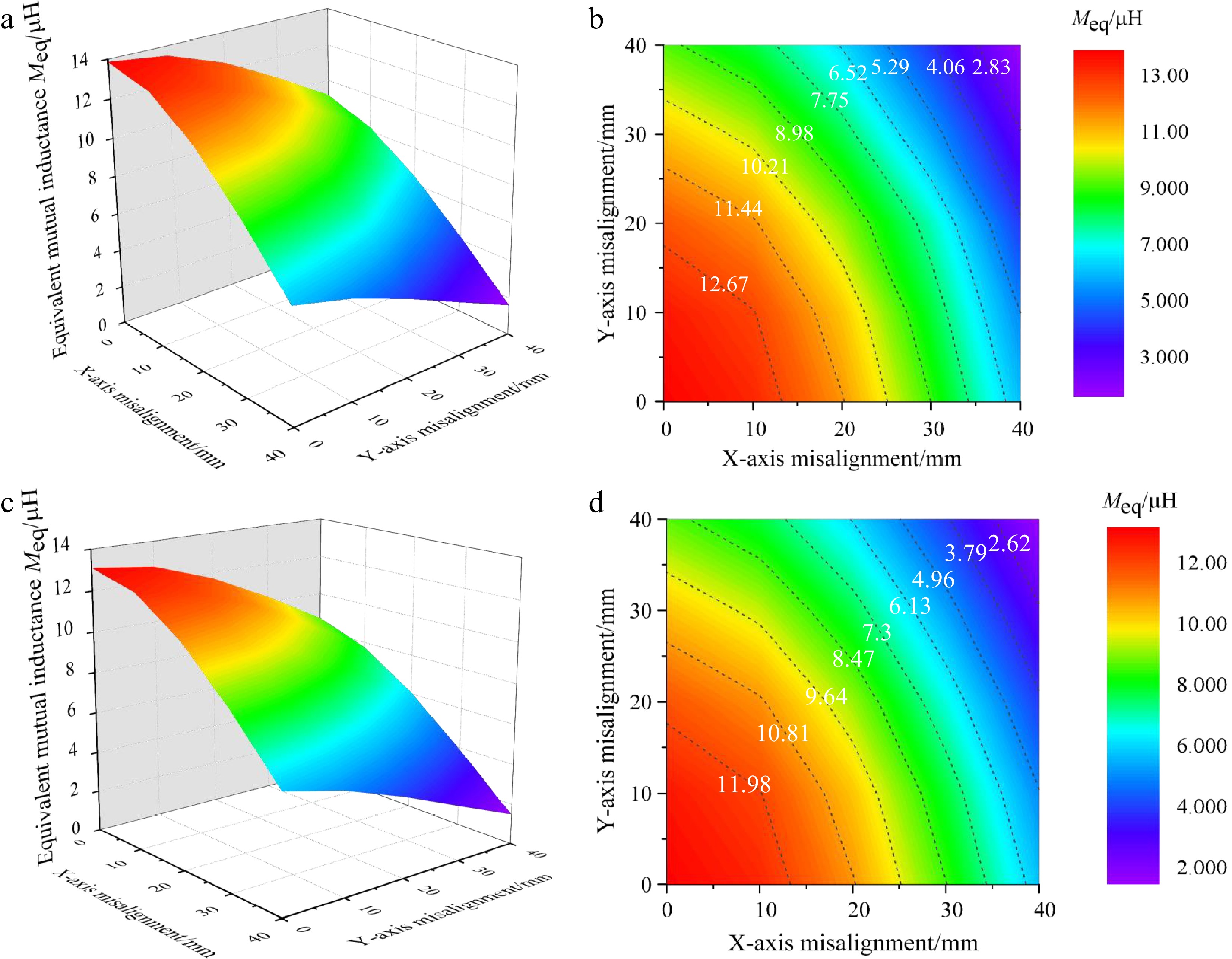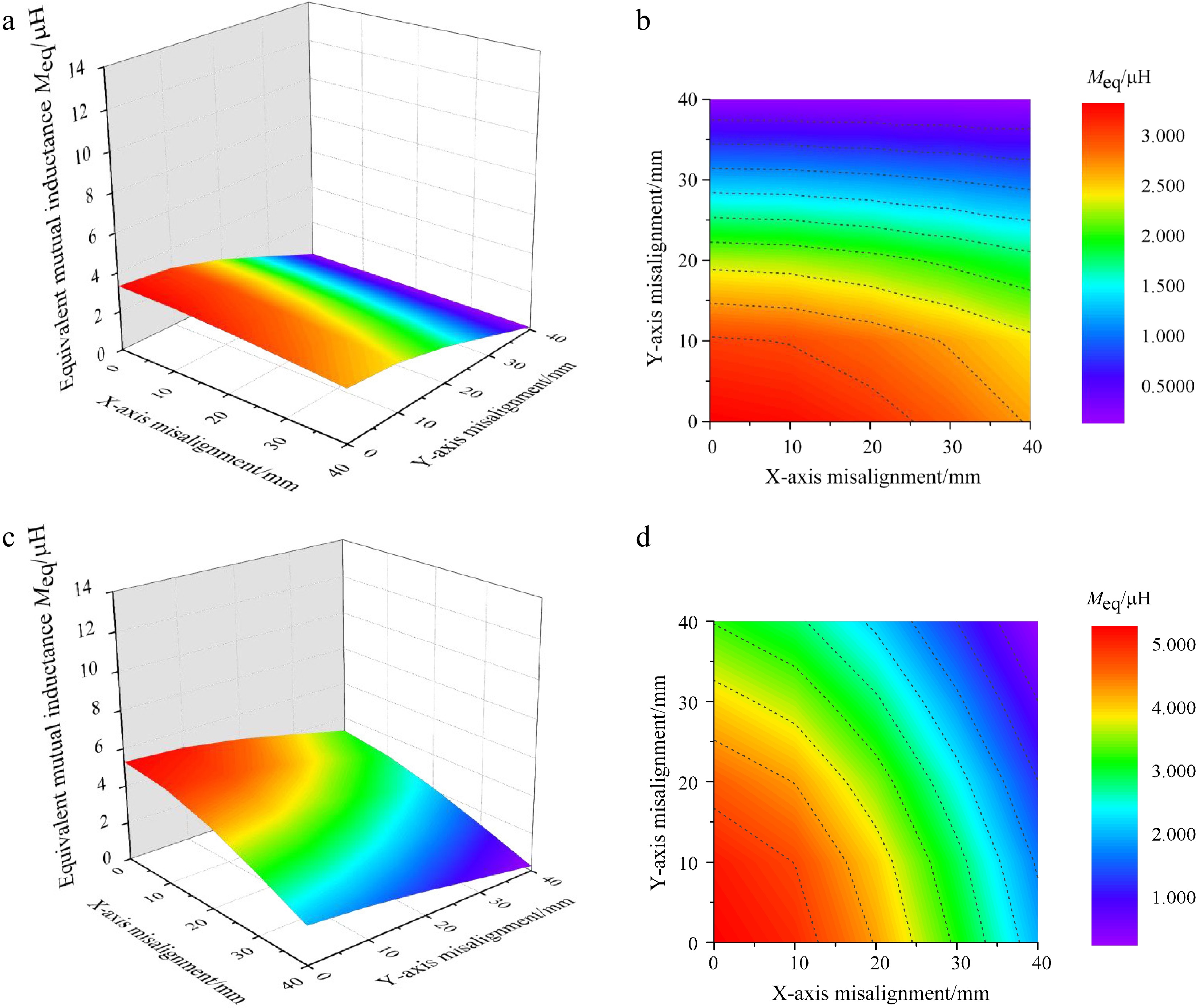 As shown in Fig. 6, the 3D diagrams and front views of the mutual inductance variation for both the DVDD magnetic coupling mechanism and the single DD magnetic coupling mechanism are provided. These are for the case where no additional magnetic core is added, and when offsets occur in both X-axis and Y-axis direction. Figure 6 and b shows the mutual inductance variation for the DVDD magnetic coupling mechanism without a magnetic core when offsets occur in the X-axis and Y-axis direction. In the case where the magnetic coupling mechanism is aligned, the coil's equivalent mutual inductance is 5.2937 μH. After a 40 mm offset in the X-axis direction, the coil's equivalent mutual inductance is 3.2471 μH, showing a 38.66% change in mutual inductance. After a 40 mm offset in the Y-axis direction, the coil's equivalent mutual inductance is 1.990 μH, showing a 62.40% change in mutual inductance. When both X-axis and Y-axis direction experience a 40 mm offset, the equivalent mutual inductance becomes 0.254 μH, showing a 95.2% change in mutual inductance. Figure 6c and d shows the mutual inductance variation for the single DD magnetic coupling mechanism without a magnetic core when offsets occur in the X-axis and Y-axis direction. In the case where the magnetic coupling mechanism is aligned, the coil's equivalent mutual inductance is 3.3196 μH. After a 40 mm offset in the X-axis direction, the coil's equivalent mutual inductance is 0.17422 μH, showing a 94.75% change in mutual inductance. After a 40 mm offset in the Y-axis direction, the coil's equivalent mutual inductance is 2.6571 μH, showing a 19.95% change in mutual inductance. When both X-axis and Y-axis direction experience a 40 mm offset, the equivalent mutual inductance becomes 0.13229 μH, showing a 96.01% change in mutual inductance. The X-axis misalignment tolerance is significantly improved.