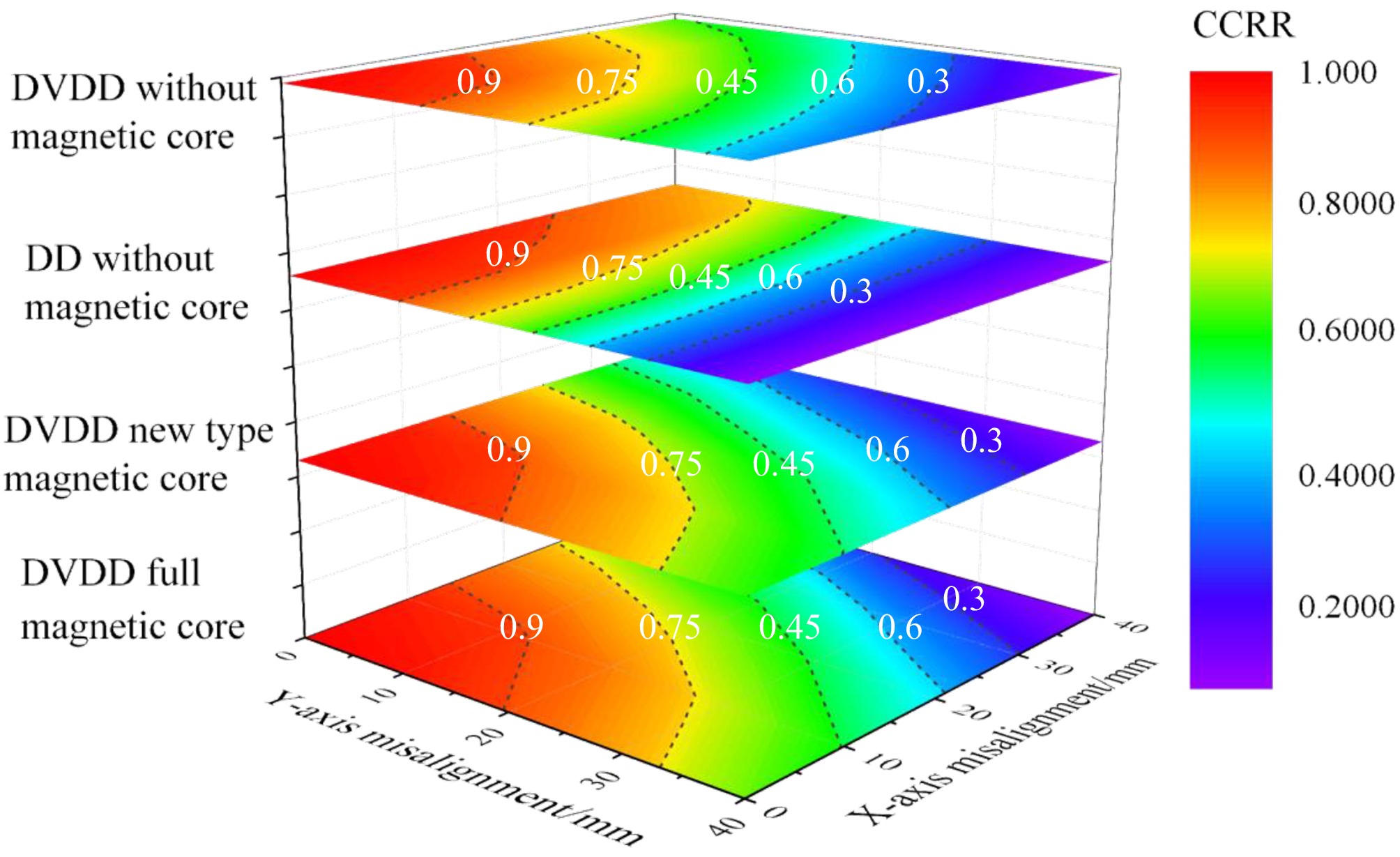 where, CCRR represents the Coupling Coefficient Retaining Ratio of the magnetic coupling mechanism, keq0 represents the equivalent magnetic coupling coefficient when the coupler is aligned, and keqmis represents the equivalent coupling coefficient when the coupler is misaligned. The larger the CCRR value, the stronger the misalignment resistance ability of the magnetic coupling mechanism.