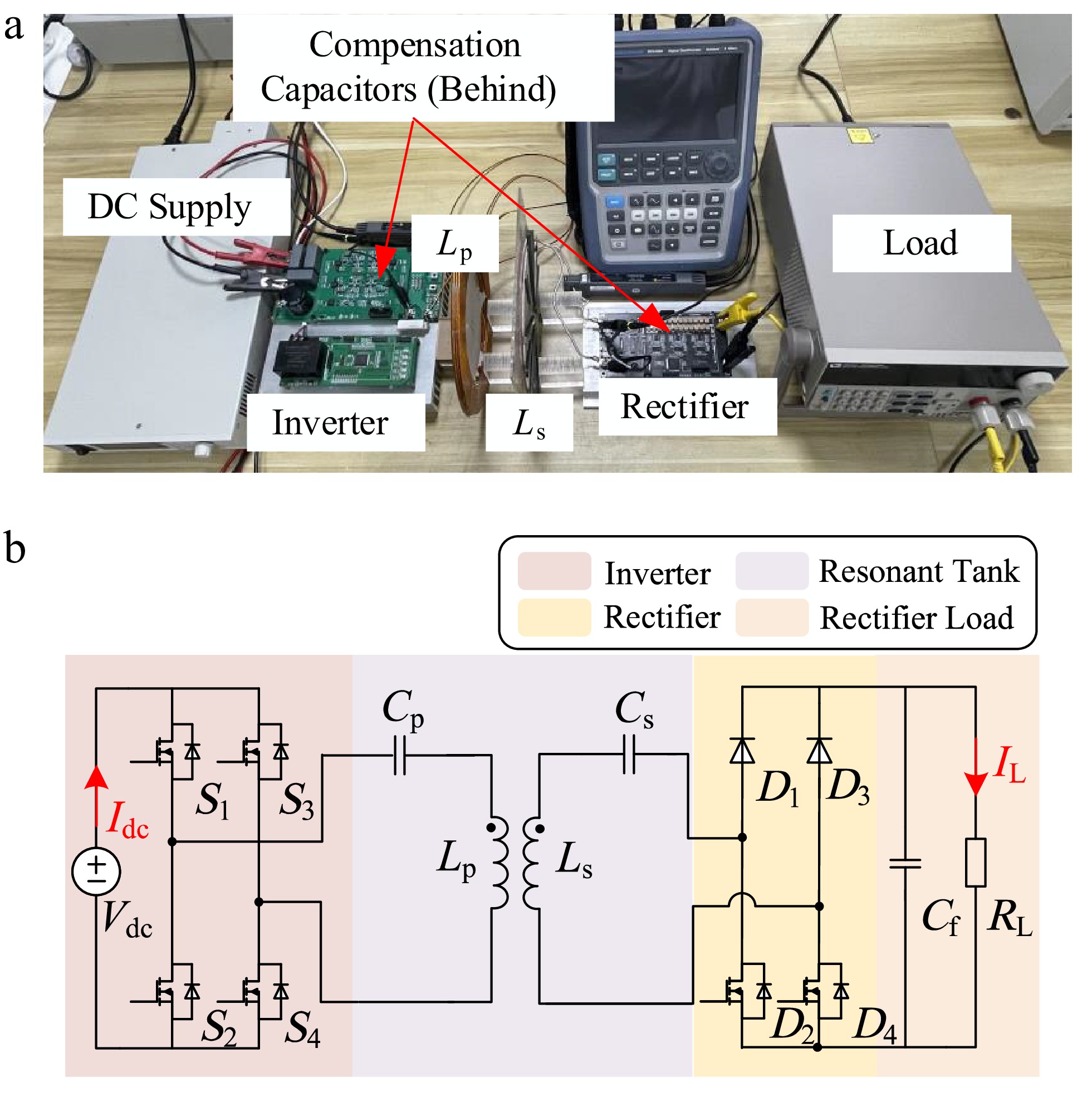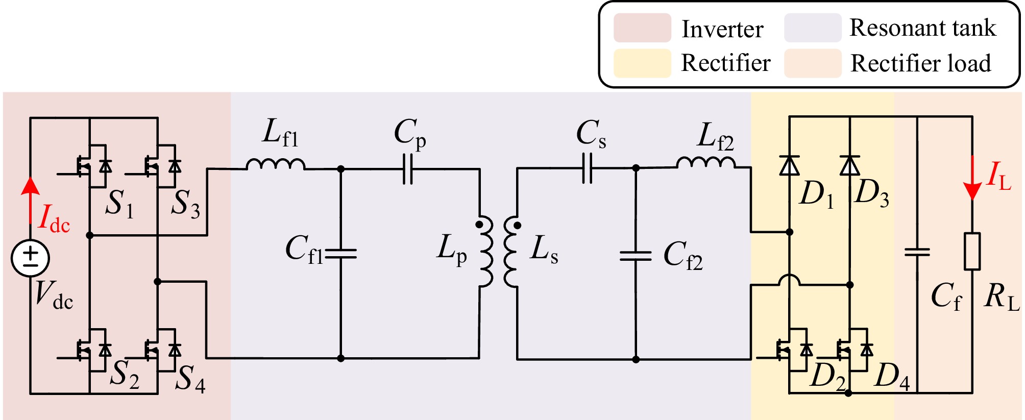 • This article report on series-series (SS), and dual-side LCC WPT systems. The dual-side LCC WPT system is investigated in this and the simulation verification sections, while the SS WPT system will be investigated in the experimental verification section. The circuit topology of the dual-side LCC WPT system is depicted in Fig. 1. Here, ${V_{{\text{dc}}}}$ denotes the dc input voltage. The primary and secondary coils, ${L_{\text{p}}}$ and ${L_{\text{s}}}$, are connected in series with their compensation capacitors ${C_{\text{p}}}$ and ${C_{\text{s}}}$ to compensate for the leakage inductance. Additionally, ${L_{{\text{f1}}}}$ and ${C_{{\text{f1}}}}$ represent the primary-side compensation inductance and capacitance, while ${L_{{\text{f2}}}}$ and ${C_{{\text{f2}}}}$ correspond to the secondary-side compensation inductance and capacitance. The output filter capacitor is denoted as ${C_{\text{f}}}$.