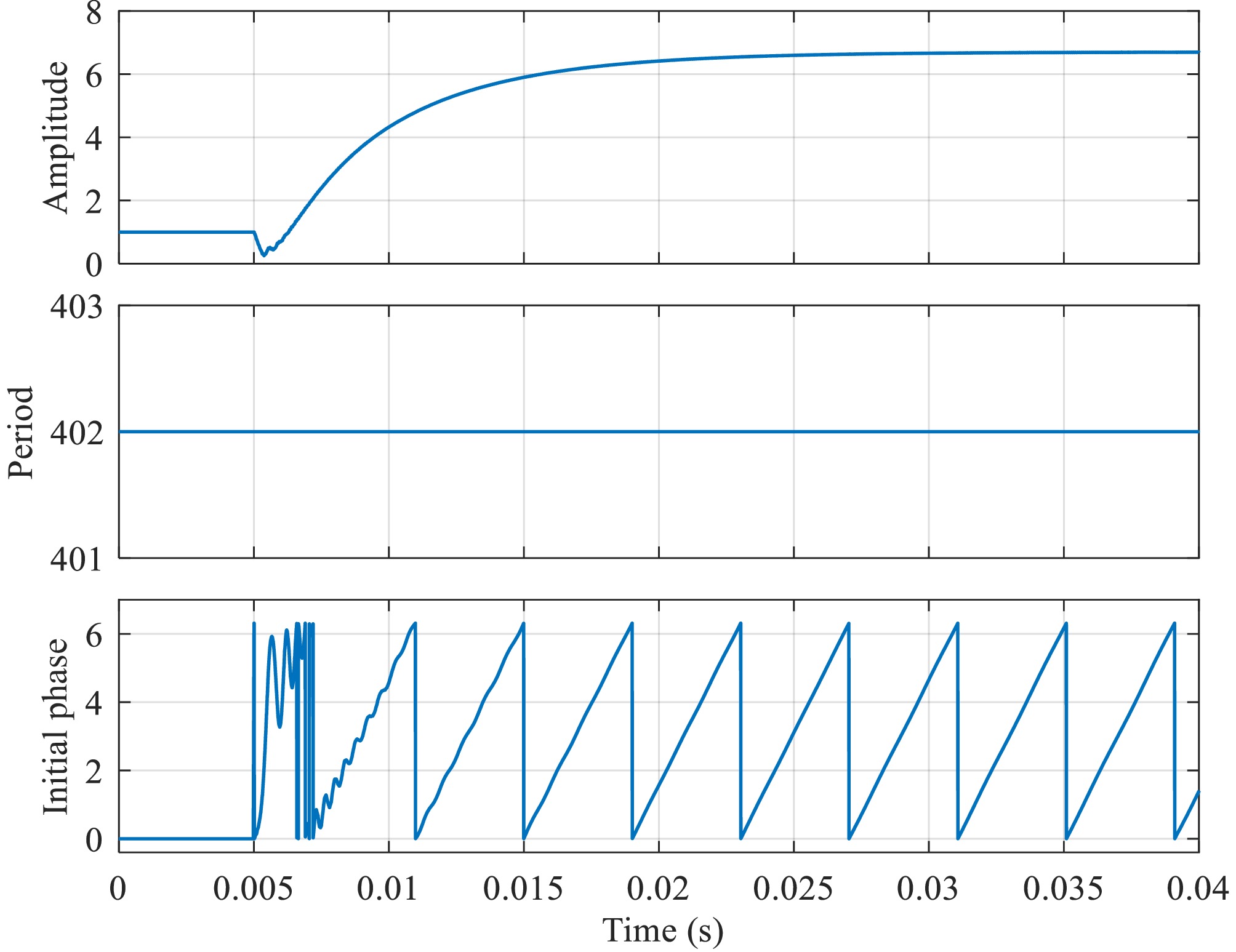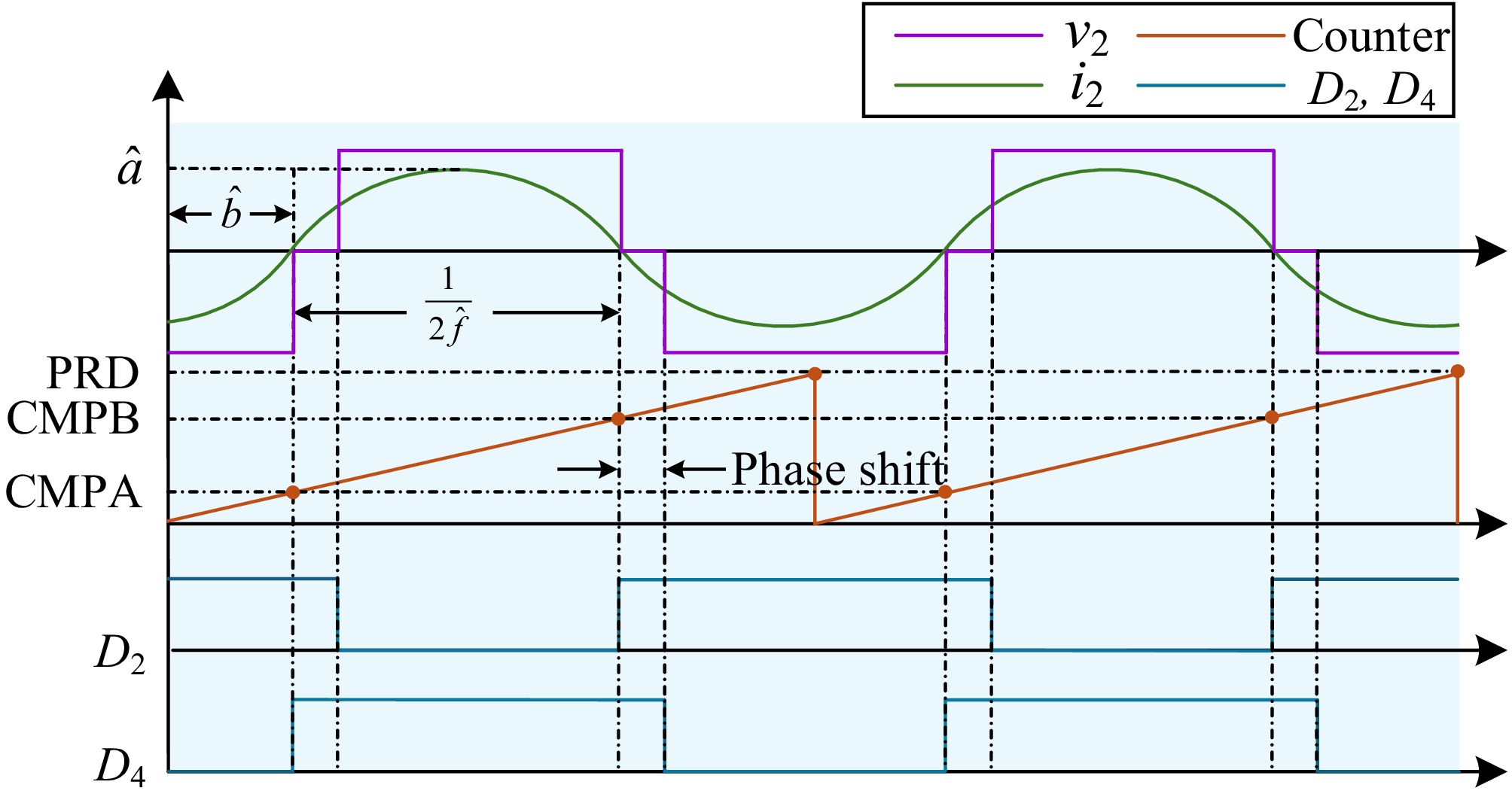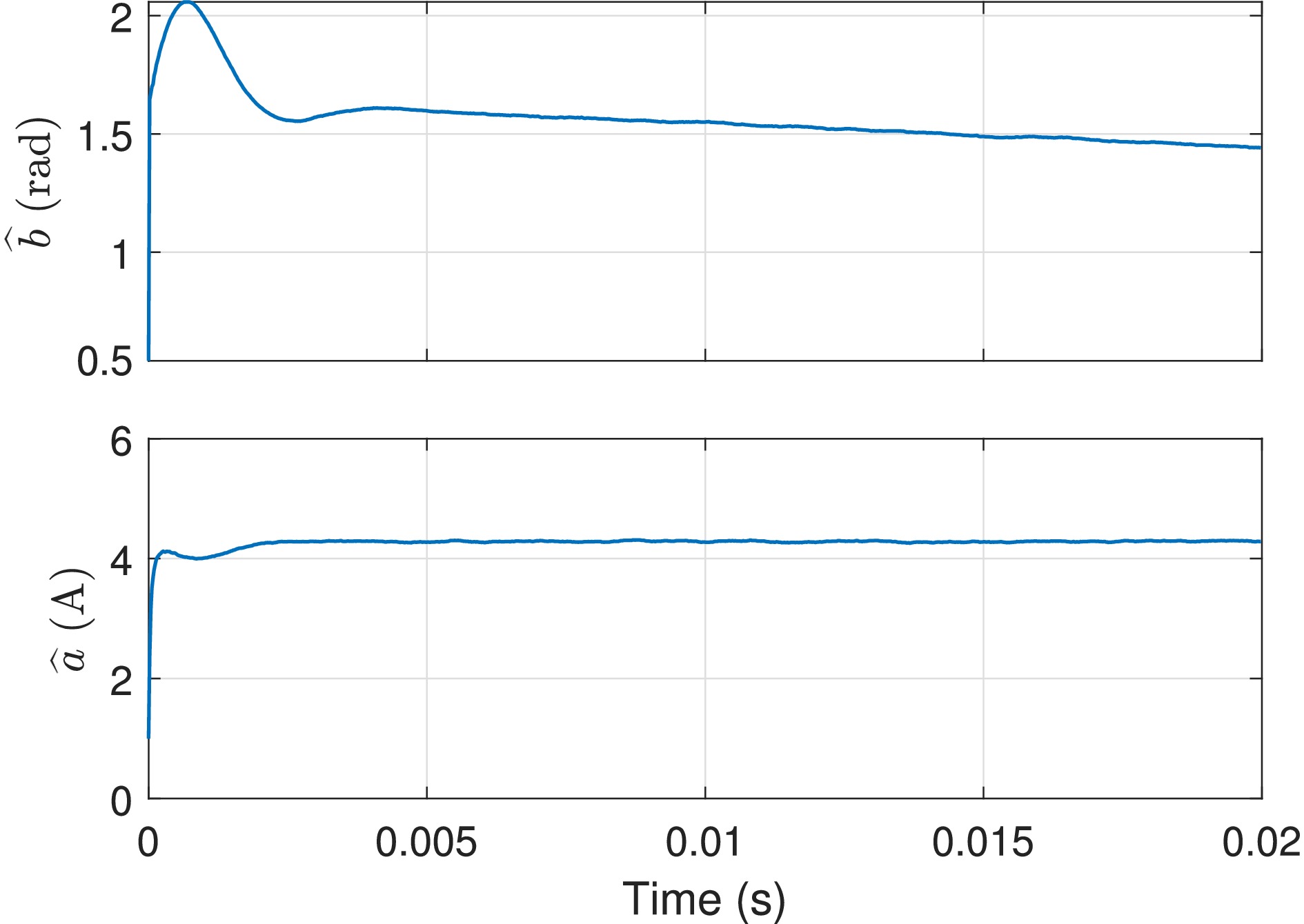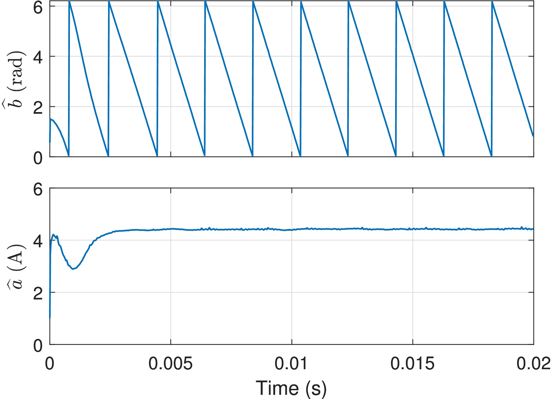 Then, by using the estimated frequency as the basis to configure the PWM module of the secondary DSP, the waveform of ${v_{\text{1}}}$, ${i_{\text{1}}}$, ${v_{\text{2}}}$, and ${i_2}$ are shown in Fig. 17, while the estimated parameters are plotted in Fig. 18, where it can be seen that the estimated initial phase $\hat b$ becomes constant when the estimated frequency ${f_{\text{s}}}$ in Eq. (20) is used to configure the PWM module.