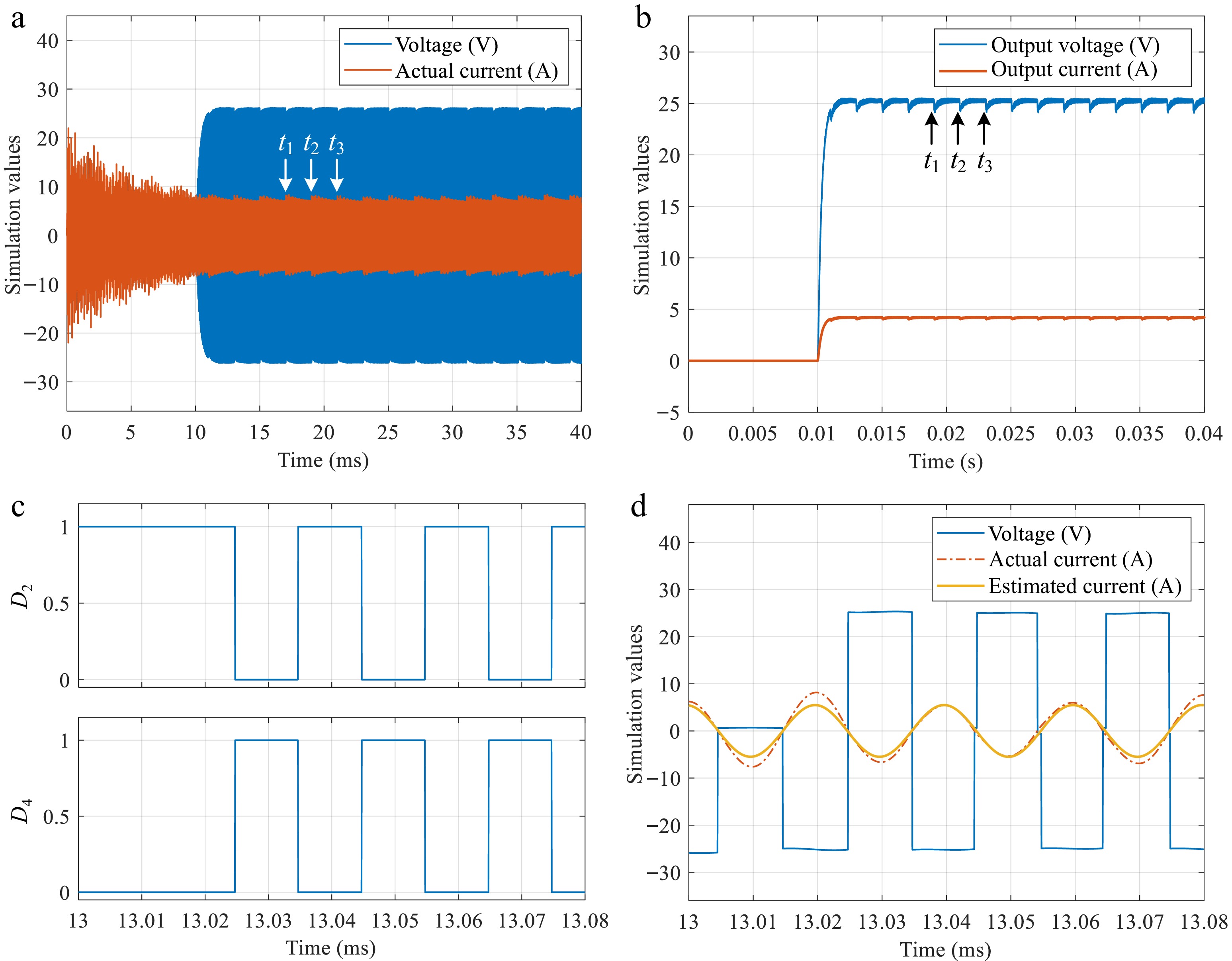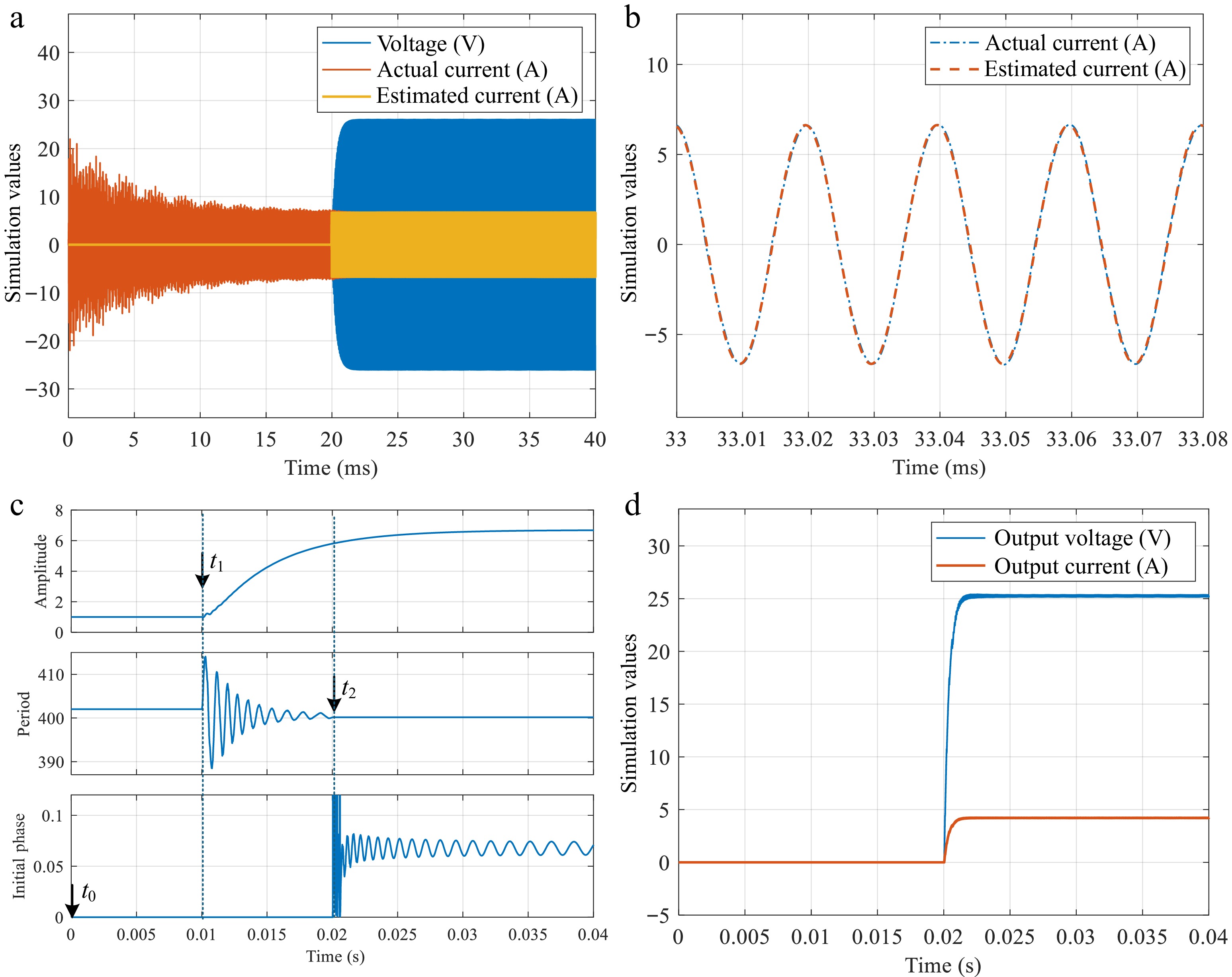 Waveform of ${v_{\text{2}}}$ and ${i_2}$ using the estimated frequency. (a) Waveform of ${v_2},$${i_2}$, and the estimated ${i_2}$. (b) Zooming-in waveform of ${i_2}$, and the estimated ${i_2}$. (c) Parameter estimates. (d) Output voltage and current on ${R_{\text{L}}}$.