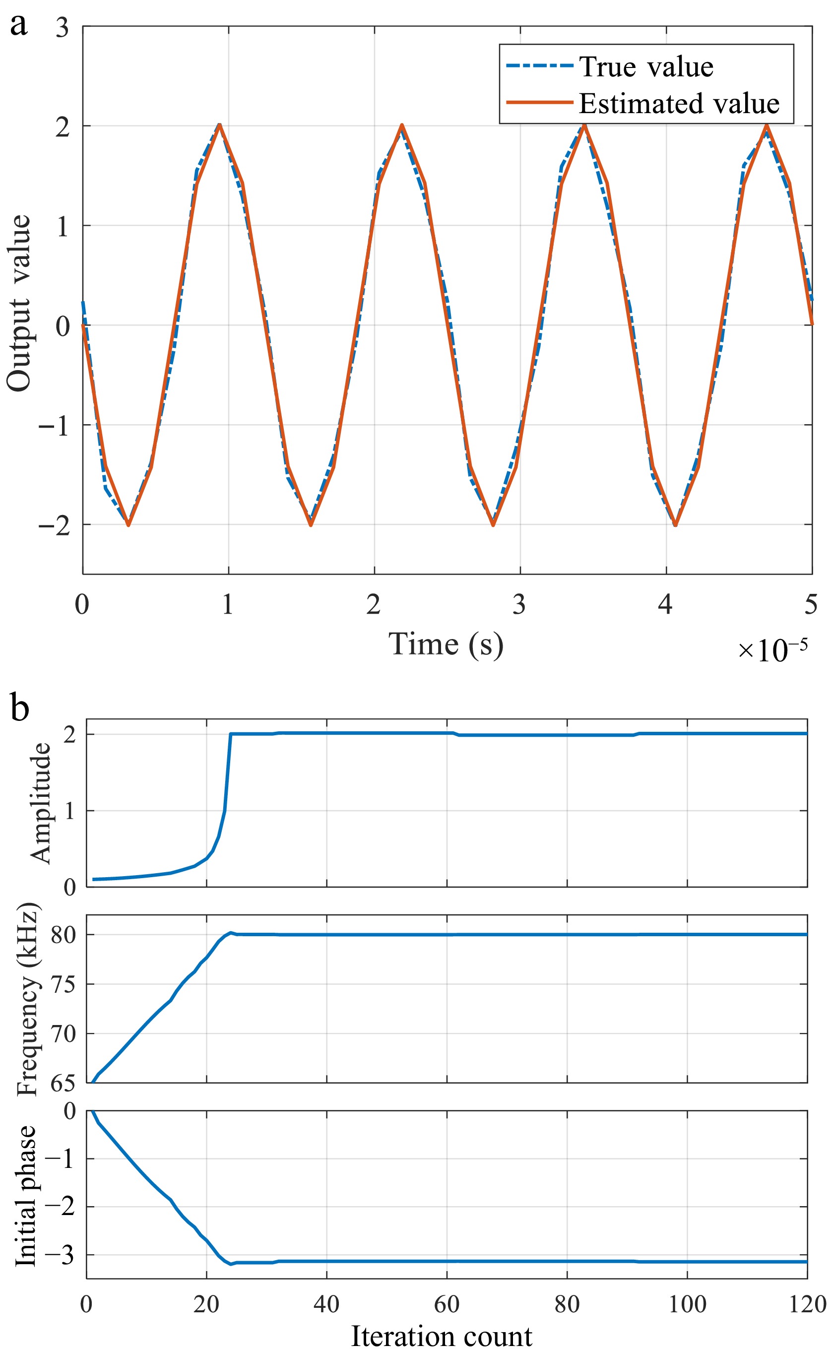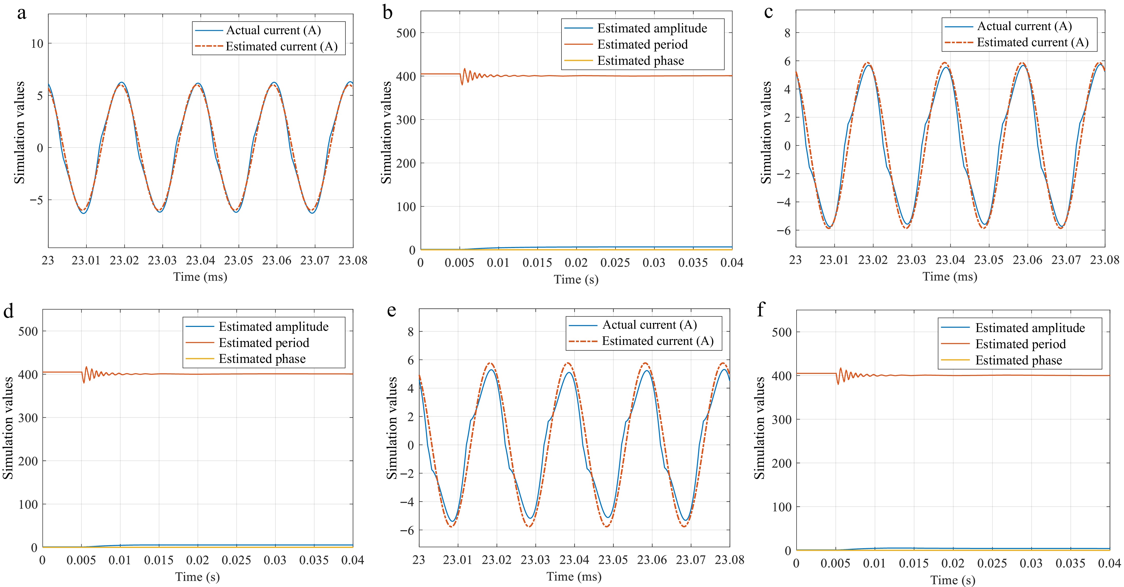 It is necessary to estimate the amplitude $ a $, the frequency $ f $, and the initial phase $ b $ in real-time based on the sampled data $\{ i_{2,\ell }^ * \} _{\ell = 1}^N$. Here, ${( \cdot )^ * }$ denotes the sampled version of $( \cdot )$, and the subscript $\ell $ represents the sampling time index. The three parameters to be estimated are gathered in the vector $\theta = {[a,f,b]^{\text{T}}}$, so the parameter estimation problem can be defined as follows:
