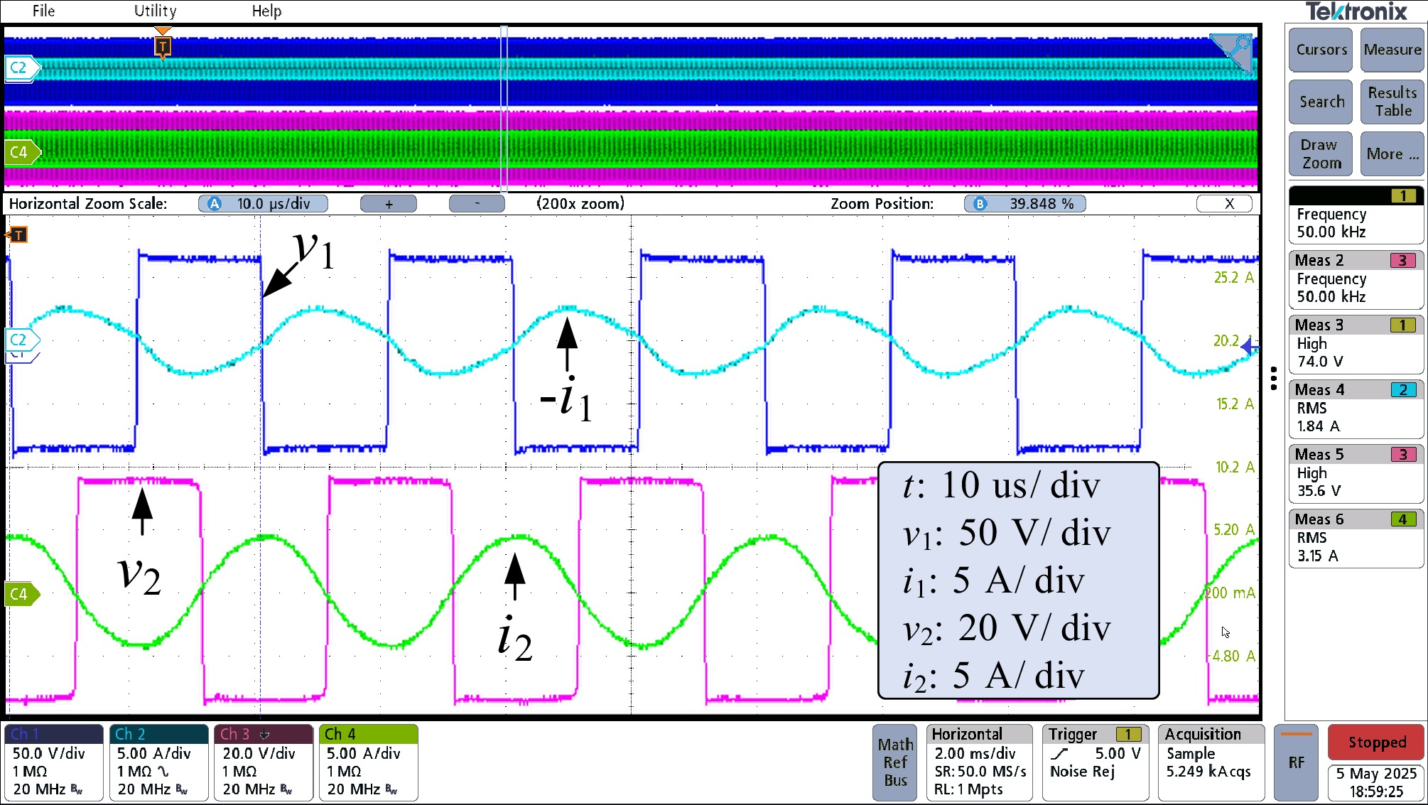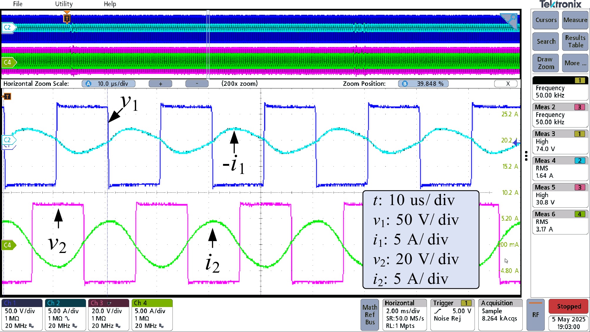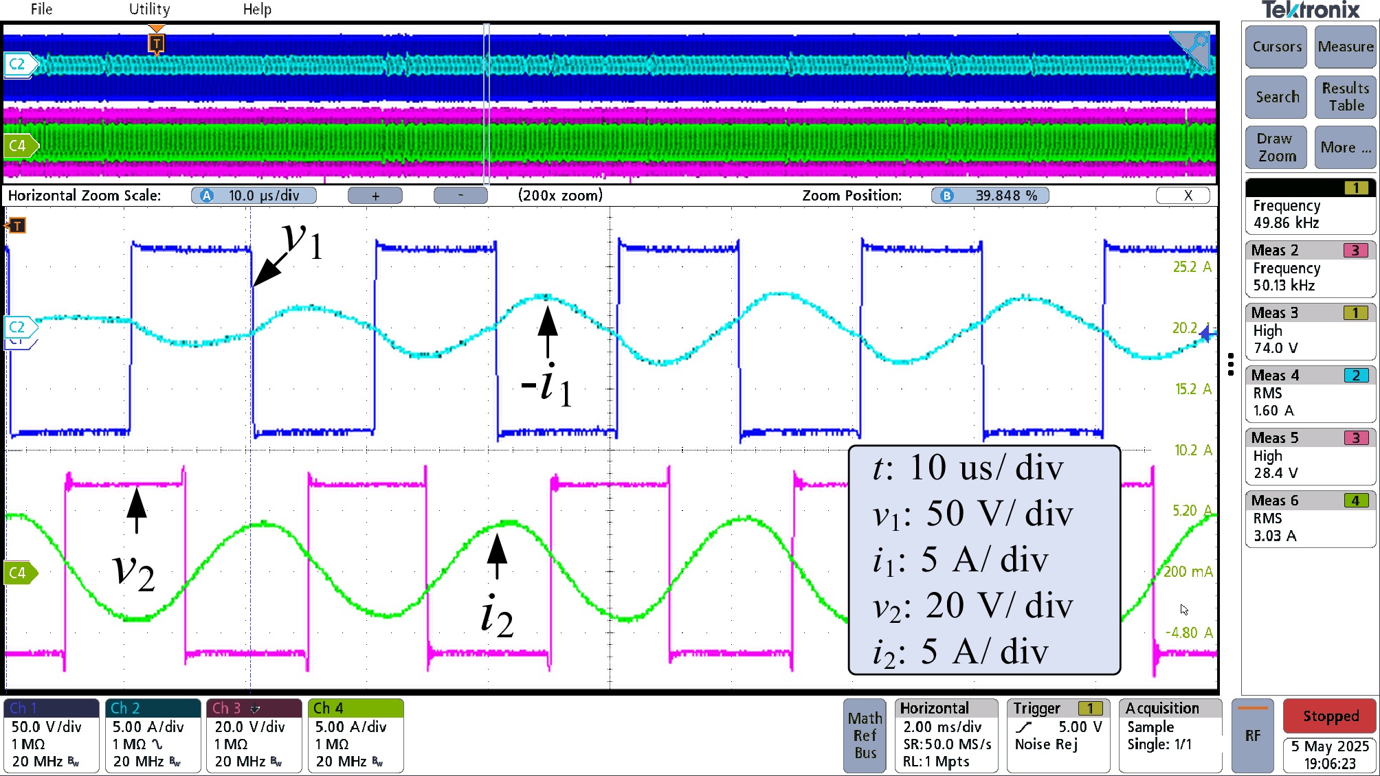 Waveform of v1, i1, v2, and i2 in the active bridge mode with frequency mismatch (fs = 50.5 kHz).