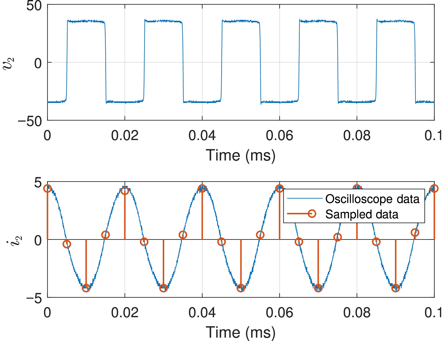 ● Switch off the four MOSFETs of the active rectifier to enable the diode bridge mode. When the system enters a stationary state, ${i_2}$ is sampled at the rate of 200 kHz to generate the data for frequency estimation.