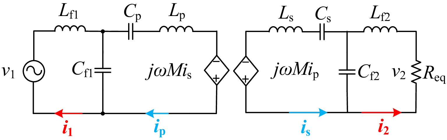 To simplify the analysis, the equivalent series resistances of the resonant components are neglected. The resulting simplified equivalent circuit is presented in Fig. 2. In this diagram, ${v_1}$ represents the output voltage of is inverter, ${i_1}$ denotes the output current of the inverter, ${i_{\text{p}}}$ is the current flowing through the transmitting coil ${L_{\text{p}}}$, ${i_{\text{s}}}$ is the current in the receiving coil ${L_{\text{s}}}$, and ${i_{{\text{f2}}}}$ corresponds to the current fed to the rectifier.