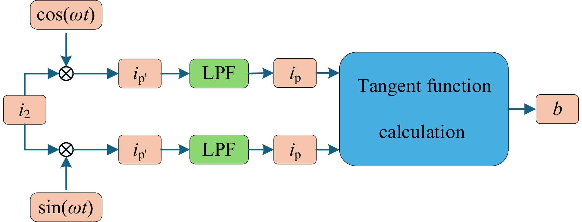 The PQ method is a technique based on the calculation of active power (P) and reactive power (Q) to estimate the phase angle between voltage and current. By leveraging these power components, the method enables accurate phase estimation. Specifically, for the rectifier input current ${i_2} = a\sin (\omega t + b)$, the signal ${i_2}$ is decomposed into two orthogonal components through multiplication with $\cos (\omega t)$ and $\sin (\omega t)$. This process is illustrated in Fig. 4, where: