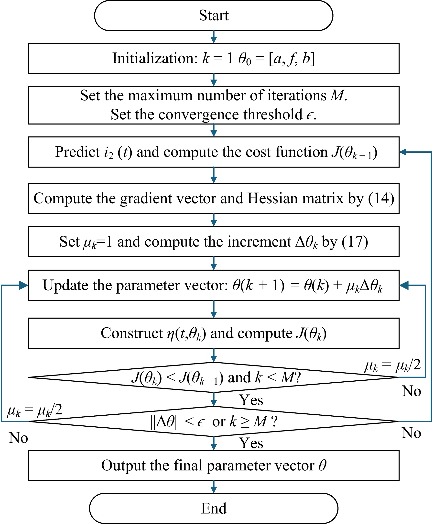 $\begin{aligned} &\hat\theta={\rm{arg}}\,\mathop{\min}\limits_{\theta}J(\theta) \\& J(\theta)=\dfrac{1}{2}\sum_{\ell =1}^{N}\Big(i_{2,\ell }^{*}-i_{2,\ell }\Big)^2\end{aligned} $ (13)