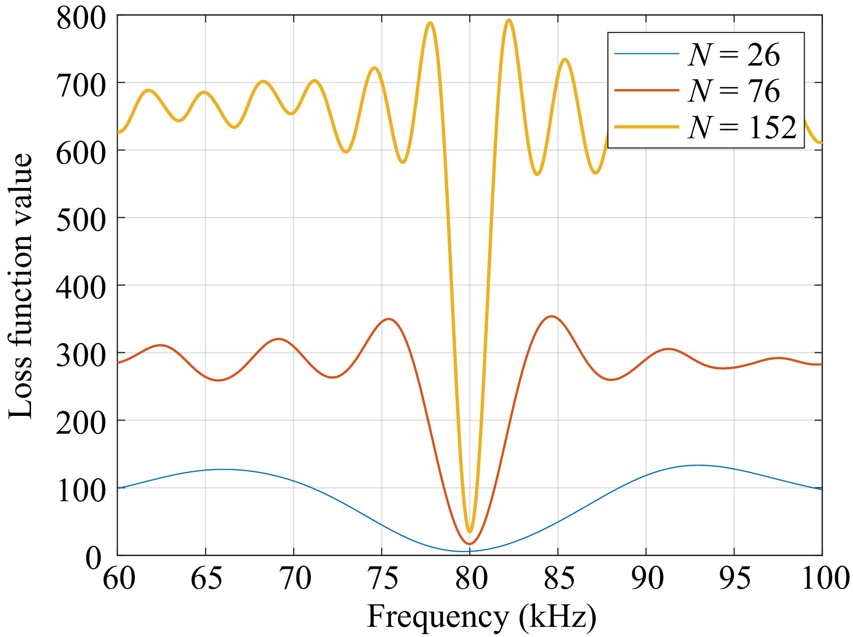 When estimating the frequency of the resonant current ${i_2}$, we account for the potential influence of harmonics. As shown in Fig. 12, the performance of the proposed frequency estimation algorithm is evaluated under different levels of harmonic distortion (${R_{\text{L}}} = 20,40,60\;\Omega $). In this case, the frequency difference between the primary and secondary sides is 1.25%. It can be observed that the frequency estimation value (represented by the number of PWM counter cycles) converges from an initial value of 405 clock cycles (corresponding to a switching frequency of 50.625 kHz) to a nominal value of 400 clock cycles (corresponding to a design frequency of 50 kHz), indicating that the algorithm can still quickly track the true frequency under 1.25% frequency mismatch conditions.