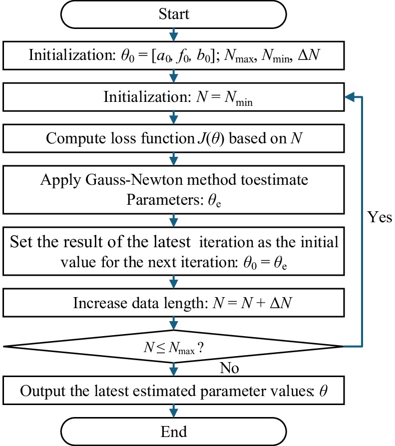 To address this issue, during the initialization phase, the two lower switches of the active rectifier bridge can be shorted simultaneously to obtain more stable and reliable sampling data of the rectifier bridge input current. Based on these sampling data, the Gauss-Newton (GN) iterative algorithm can be applied to accurately estimate the frequency and initial phase angle of the rectifier bridge input current. The flowchart of the recursive algorithm is presented in Fig. 5.