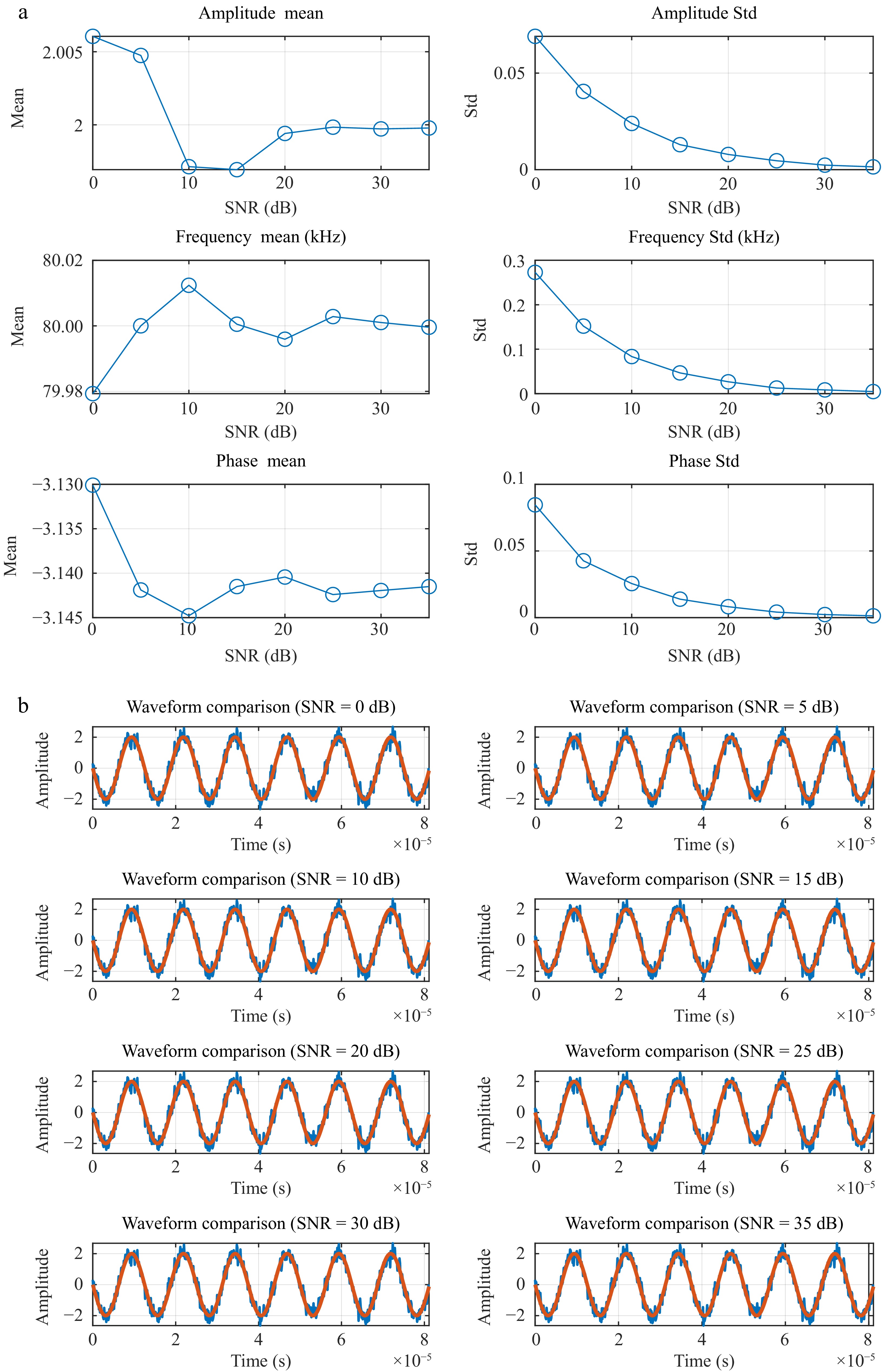 $ \begin{array}{*{20}{c}}\phi_{\ell}(\theta)=\left[\begin{array}{*{20}{c}}\dfrac{\partial i_2}{\partial a} & \dfrac{\partial i_2}{\partial f} & \dfrac{\partial i_2}{\partial b}\end{array}\right]^{\text{T}}|_{t=t_{\ell}}=\left[\begin{array}{*{20}{c}}\sin\left(\omega t_{\ell}+b\right) \\ 2\pi t_{\ell}a\cos\left(\omega t_{\ell}+b\right) \\ a\cos\left(\omega t_{\ell}+b\right)\end{array}\right]\end{array} $ (15)
