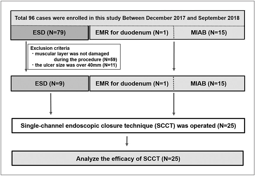 Methods: Twenty-five consecutive patients who underwent endoscopic treatment and whose artificial ulcer was closed using the SCCT were enrolled in this study. The technical success rate, number of clips for closure, procedure time, complication rate on the day of the procedure, clinical success rates on days 1 and 5, and incidence of severe stenosis of the gastrointestinal (GI) tract at 2 months after the procedure were evaluated.