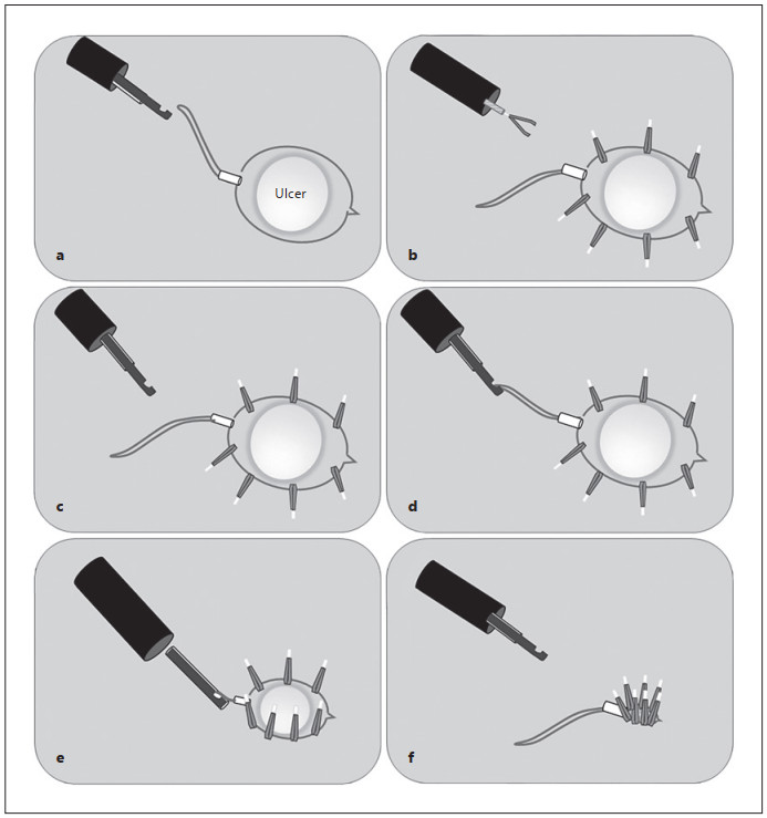 Conclusion: The SCCT could be applied in the treatment of artificial ulcers in several parts of the GI tract with a high clinical success rate and no complications. The SCCT appears to be a good option for closing artificial mucosal ulcers.