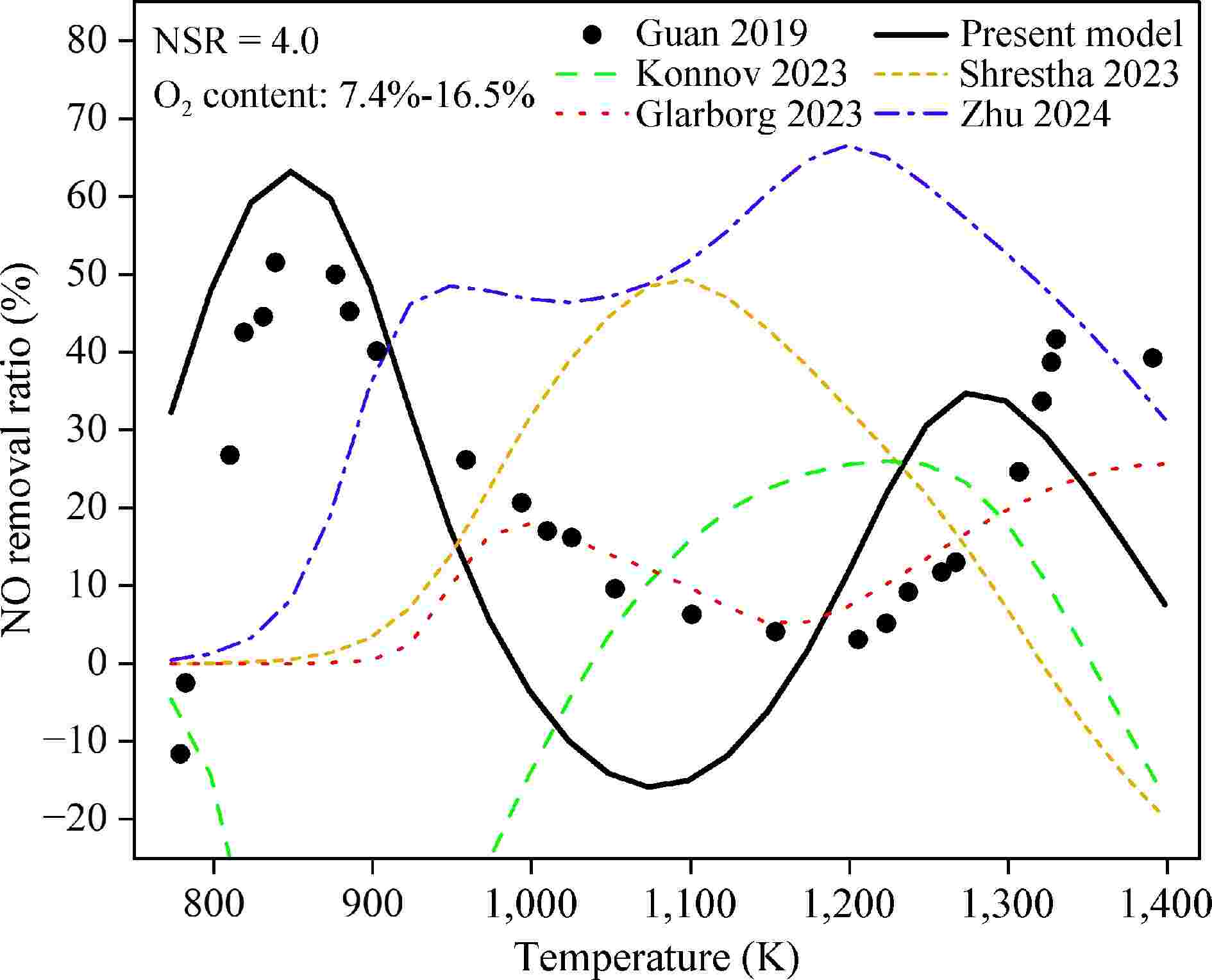 • In this study, the perfect stirred reactor (PSR) module in ANSYS CHEMKIN-PRO[50] software was used for the simulations. The simulation conditions are consistent with those of Guan et al.[23]. The detailed simulation conditions are summarized in Table 2. Since NOx mainly comes from the combustion of hydrocarbon fuels, which simultaneously produces H2O and CO2 as major products. CO2 and H2O, accompanied with NOx were adopted to stimulate flue gas components. The complete kinetic mechanism comprises 43 species and 313 reactions, and the kinetic, thermodynamic, and transport files of this model can be found in the supplementary information.