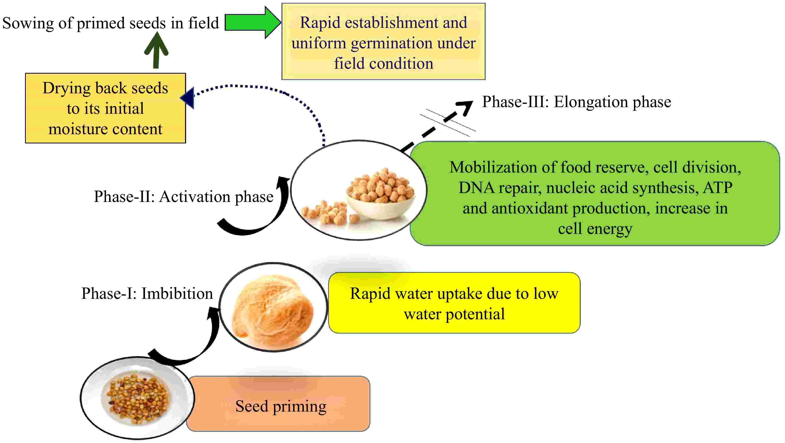 Seed priming enhances germination and vigor by triggering various molecular, physiological, and biochemical changes. These include improved reserve mobilization, faster RNA and protein synthesis, increased nutrient content, better membrane integrity, reduced oxidative stress, and enhanced enzyme activity. These factors collectively contribute to the improved performance of primed seeds[22−24].