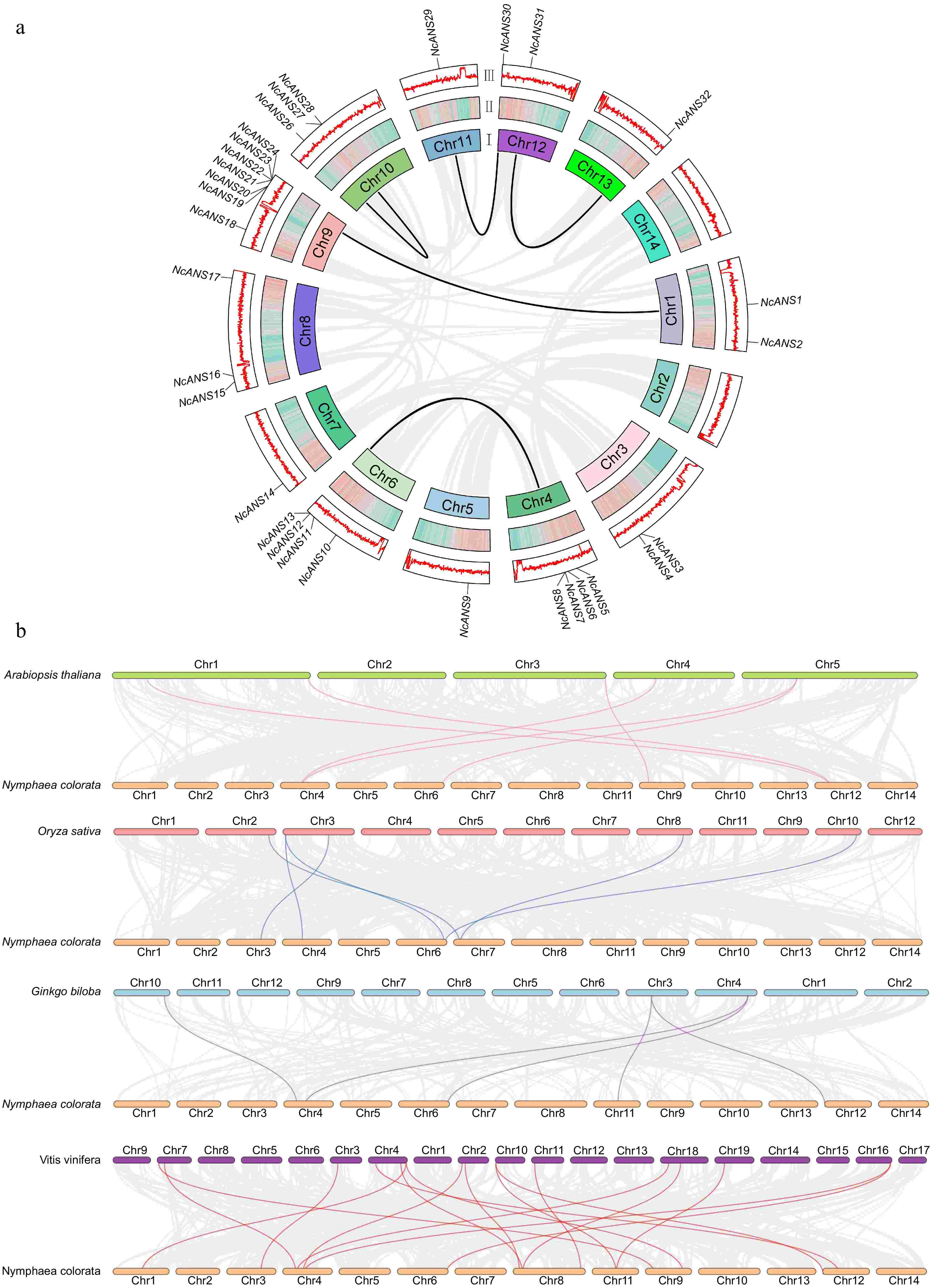 • To investigate the evolutionary relationships of the NcANS genes, an intraspecific synteny analysis of the N. colorata genome was conducted. The analysis identified five syntenic gene pairs within the NcANS gene family, located on chromosomes chr1, chr4, chr6, chr9, chr10, chr11, chr12, and chr13. Specifically, NcANS1 showed synteny with NcANS19; NcANS25 was syntenic with NcANS27; NcANS29 was syntenic with NcANS30; NcANS8 was syntenic with NcANS13 and NcANS7 was syntenic with NcANS12. These findings suggest that some members of the NcANS gene family may have arisen through gene duplication events and may possess functional similarities (Fig. 4a). To further investigate the evolutionary dynamics of the NcANS gene in N. colorata, we conducted synteny analysis using four representative model plant species with high-quality genome assemblies Arabidopsis thaliana, Oryza sativa, Ginkgo biloba, and Vitis vinifera along with the water lily genome. Figure 4b exhibited that N. colorata shares six syntenic ANS gene pairs with A. thaliana and O. sativa, five pairs with G. biloba, and up to 17 pairs with V. vinifera (Fig. 4b). These results suggest that the homologous genes of N. colorata were more abundant in dicotyledons than in monocotyledons.