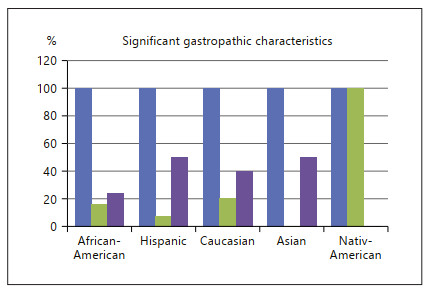 African American Hispanic Caucasian Asian Native American p value Patients, N 160 94 30 4 4 Reactive gastropathy, n (%) No 1 (0.6) 0 (0.0) 0 (0.0) 0 (0.0) 0 (0.0) 0.93 Yes 159 (99.4) 94 (100.0) 30 (100.0) 4 (100.0) 4 (100.0) Gastritis, n (%) No 22 (13.8) 9 (9.6) 4 (13.3) 0 (0.0) 0 (0.0) 0.71 Yes 138 (86.2) 85 (90.4) 26 (86.7) 4 (100.0) 4 (100.0) Esophagitis, n (%) No 146 (91.2) 86 (91.5) 25 (83.3) 4 (100.0) 4 (100.0) 0.57 Yes 14 (8.8) 8 (8.5) 5 (16.7) 0 (0.0) 0 (0.0) Duodenitis, n (%) No 158 (98.8) 86 (91.5) 27 (90.0) 3 (75.0) 4 (100.0) 0.01 Yes 2 (1.2) 8 (8.5) 3 (10.0) 1 (25.0) 0 (0.0) Fibrosis, n (%) No 158 (98.8) 92 (97.9) 30 (100.0) 4 (100.0) 4 (100.0) 0.92 Yes 2 (1.2) 2 (2.1) 0 (0.0) 0 (0.0) 0 (0.0) Erosions, n (%) No 154 (96.2) 92 (97.9) 29 (96.7) 3 (75.0) 4 (100.0) 0.18 Yes 6 (3.8) 2 (2.1) 1 (3.3) 1 (25.0) 0 (0.0) Diverticulosis, n (%) No 158 (98.8) 94 (100.0) 30 (100.0) 4 (100.0) 4 (100.0) 0.8 Yes 2 (1.2) 0 (0.0) 0 (0.0) 0 (0.0) 0 (0.0) Abscess, n (%) No 158 (98.8) 94 (100.0) 30 (100.0) 4 (100.0) 4 (100.0) 0.8 Yes 2 (1.2) 0 (0.0) 0 (0.0) 0 (0.0) 0 (0.0) Intraepithelial lymphocytosis, n (%) No 156 (97.5) 88 (93.6) 28 (93.3) 4 (100.0) 4 (100.0) 0.54 Yes 4 (2.5) 6 (6.4) 2 (6.7) 0 (0.0) 0 (0.0) Schatzki ring, n (%) No 157 (98.1) 94 (100.0) 30 (100.0) 4 (100.0) 4 (100.0) 0.65 Yes 3 (1.9) 0 (0.0) 0 (0.0) 0 (0.0) 0 (0.0) Stricture, n (%) No 158 (98.8) 94 (100.0) 30 (100.0) 4 (100.0) 4 (100.0) 0.8 Yes 2 (1.2) 0 (0.0) 0 (0.0) 0 (0.0) 0 (0.0) Melanosis coli, n (%) No 158 (98.8) 94 (100.0) 28 (93.3) 4 (100.0) 4 (100.0) 0.11 Yes 2 (1.2) 0 (0.0) 2 (6.7) 0 (0.0) 0 (0.0) Foamy macrophages, n (%) No 160 (100.0) 92 (97.9) 30 (100.0) 4 (100.0) 4 (100.0) 0.37 Yes 0 (0.0) 2 (2.1) 0 (0.0) 0 (0.0) 0 (0.0) Ulcer, n (%) No 124 (77.5) 74 (78.7) 28 (93.3) 2 (50.0) 2 (50.0) 0.1 Yes 36 (22.5) 20 (21.3) 2 (6.7) 2 (50.0) 2 (50.0) Location, n (%) Antrum 158 (98.8) 91 (96.8) 28 (93.3) 4 (100.0) 4 (100.0) 0.45 Body 137 (85.6) 77 (81.9) 26 (86.7) 4 (100.0) 4 (100.0) 0.7 Duodenum 4 (2.5) 8 (8.5) 3 (10.0) 1 (25.0) 0 (0.0) 0.07 Esophagus 8 (5.0) 0 (0.0) 1 (3.3) 0 (0.0) 0 (0.0) 0.27 Incisura 26 (16.2) 6 (6.4) 6 (20.0) 0 (0.0) 4 (100.0) <0.001 Fundus 8 (5.0) 4 (4.3) 2 (6.7) 0 (0.0) 0 (0.0) 0.95 Pylorus 4 (2.5) 0 (0.0) 0 (0.0) 0 (0.0) 0 (0.0) 0.5 Hiatal hernia, n (%) No 143 (89.4) 86 (91.5) 29 (96.7) 3 (75.0) 4 (100.0) 0.52 Yes 17 (10.6) 8 (8.5) 1 (3.3) 1 (25.0) 0 (0.0) H. pylori, n (%) No 153 (95.6) 90 (95.7) 30 (100.0) 4 (100.0) 4 (100.0) 0.79 Yes 7 (4.4) 4 (4.3) 0 (0.0) 0 (0.0) 0 (0.0) Gastric polyp, n (%) No 132 (82.5) 79 (84.0) 22 (73.3) 4 (100.0) 2 (50.0) 0.25 Yes 28 (17.5) 15 (16.0) 8 (26.7) 0 (0.0) 2 (50.0) Tissue architectural changes, n (%) None 152 (95.0) 80 (85.1) 28 (93.3) 4 (100.0) 4 (100.0) 0.004 Hyperplastic 4 (2.5) 0 (0.0) 2 (6.7) 0 (0.0) 0 (0.0) Dysplastic 4 (2.5) 4 (4.3) 0 (0.0) 0 (0.0) 0 (0.0) Metaplastic 0 (0.0) 10 (10.6) 0 (0.0) 0 (0.0) 0 (0.0) Table 2.