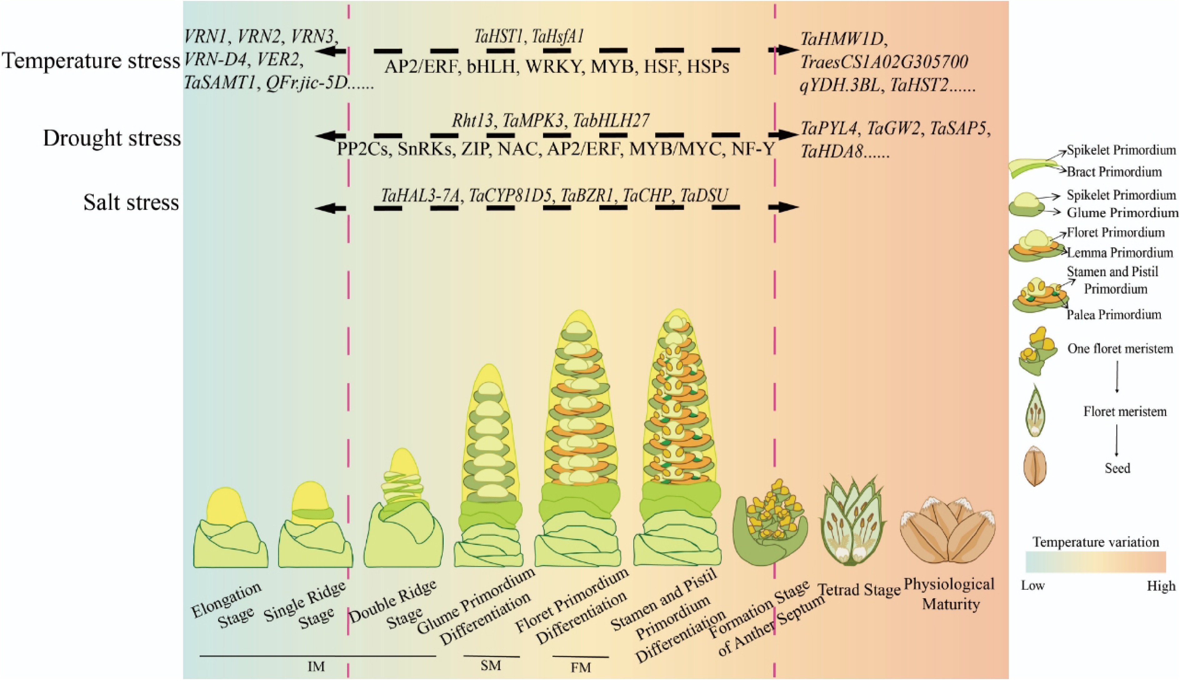 Spike development and candidate genes involved in the stresses in wheat. Abbreviations: IM, inflorescence meristem; SM, spikelet meristem; FM, floral meristem; Bidirectional dashed arrows indicate functional genes or transcription factor families identified by omics analyses that may influence multiple or all stages of spike development.