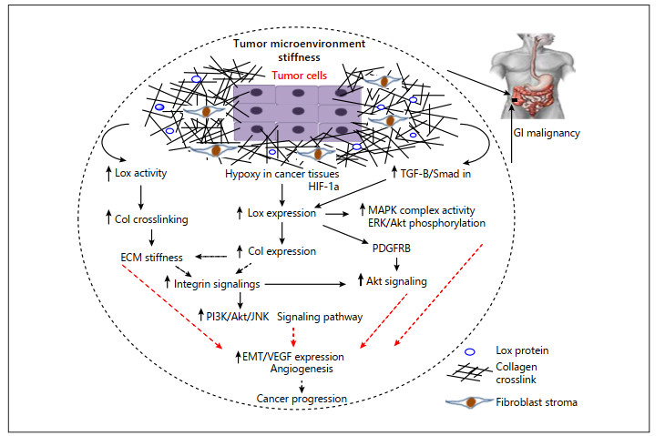 Background: Malignancy is a complex process resulting from different changes such as extracellular matrix (ECM) remodeling and stiffness. One of the important enzymes that contribute to ECM remodeling is lysyl oxidase (Lox) that is overexpressed in different types of human cancers. Because of the high prevalence and poor survival of gastrointestinal (GI) malignancies in this review, we discuss the association between Lox activity and the progression of GI cancers. Lox proteins are a group of extracellular enzymes that catalyzed the cross-linking of collagen and elastin, so they have important roles in the control of structure and homeostasis of ECM. Abnormal activation and expression of the Lox family of proteins lead to changes in the ECM toward increased rigidity and fibrosis. Stiffness of ECM can contribute to the pathogenesis of cancers.
