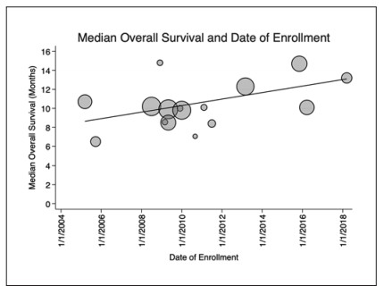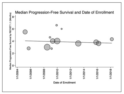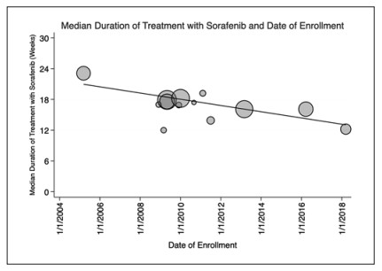 Results: Sixteen RCTs (9 phase Ⅲ and 7 phase Ⅱ) enrolling 4,086 patients treated with sorafenib were included in the analysis. Included trials enrolled patients from 2005 to 2019. OS has significantly improved by 4.5 months from 2005 to 2019 (p = 0.048) over time. Thirteen studies provided data on PFS using Response Evaluation Criteria in Solid Tumors (RECIST) 1.1, with no significant change over time (p = 0.69). ORR assessed by RECIST 1.1 has significantly improved by 6.0% over time (p = 0.003). Median duration of therapy with sorafenib has decreased by 53% since the enrollment of the first clinical trial in 2005, from 23.1 weeks to 12.2 weeks (p = 0.0037). There was no significant change in patient demographics were identified over time to explain the OS findings.