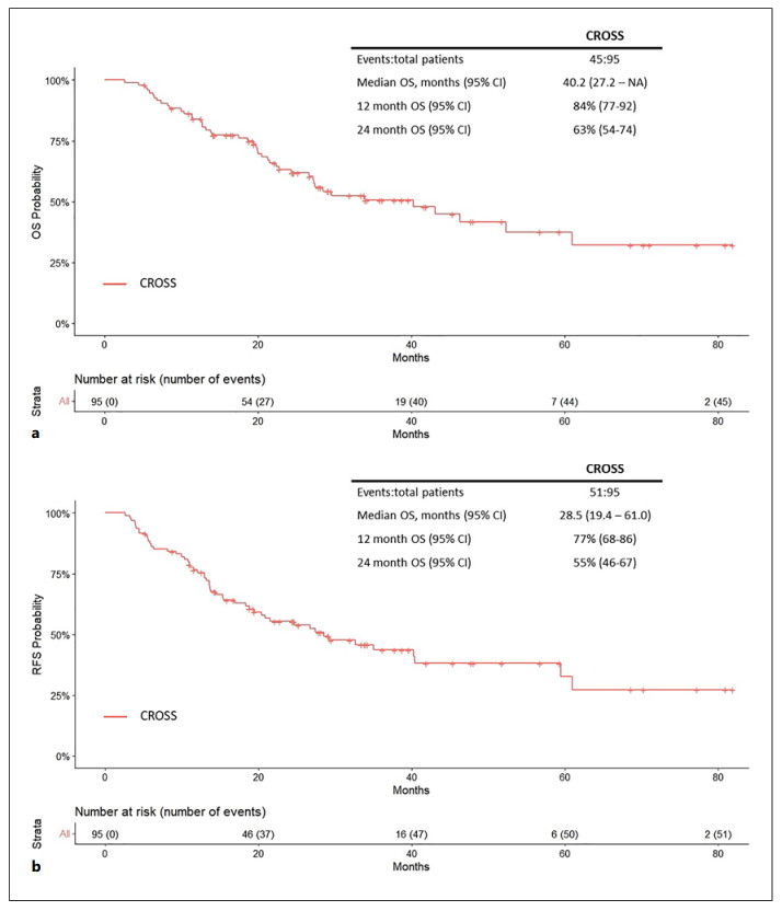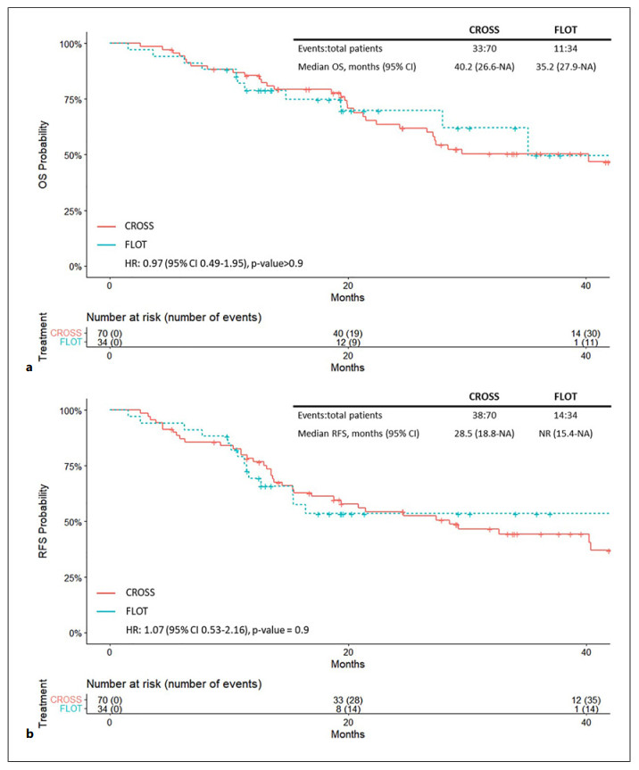 Results: The study included 168 patients. The 24-month relapse-free survival (RFS) and overall survival (OS) for FLOT were 59% and 69%, respectively. The median RFS was 29.6 months and median OS was not reached. For CROSS, the 24-month RFS and OS were 55% and 63% with a median RFS and OS of 28.5 and 40.2 months, respectively. There was no difference in OS and RFS between the treatments. FLOT was less tolerable than CROSS with more dose reductions, treatment discontinuation, and clinically relevant grade 3 and 4 toxicity. Neutrophil lymphocyte ratio was associated with survival for both treatments.