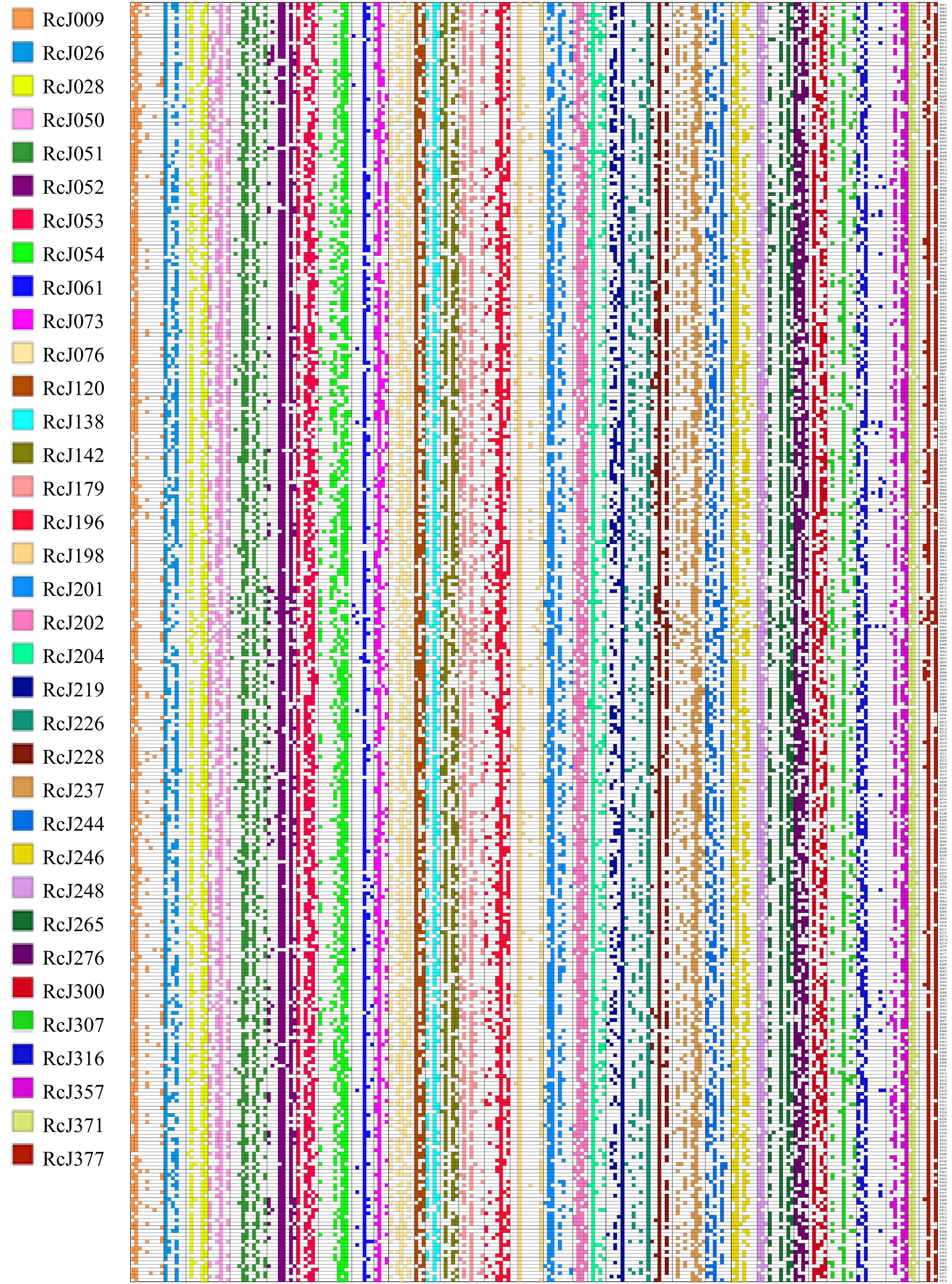 The 364 rose germplasm were converted into fingerprint profiles in the form of 01 matrices, with one color representing one locus, each row representing one sample, and each column representing one allele.