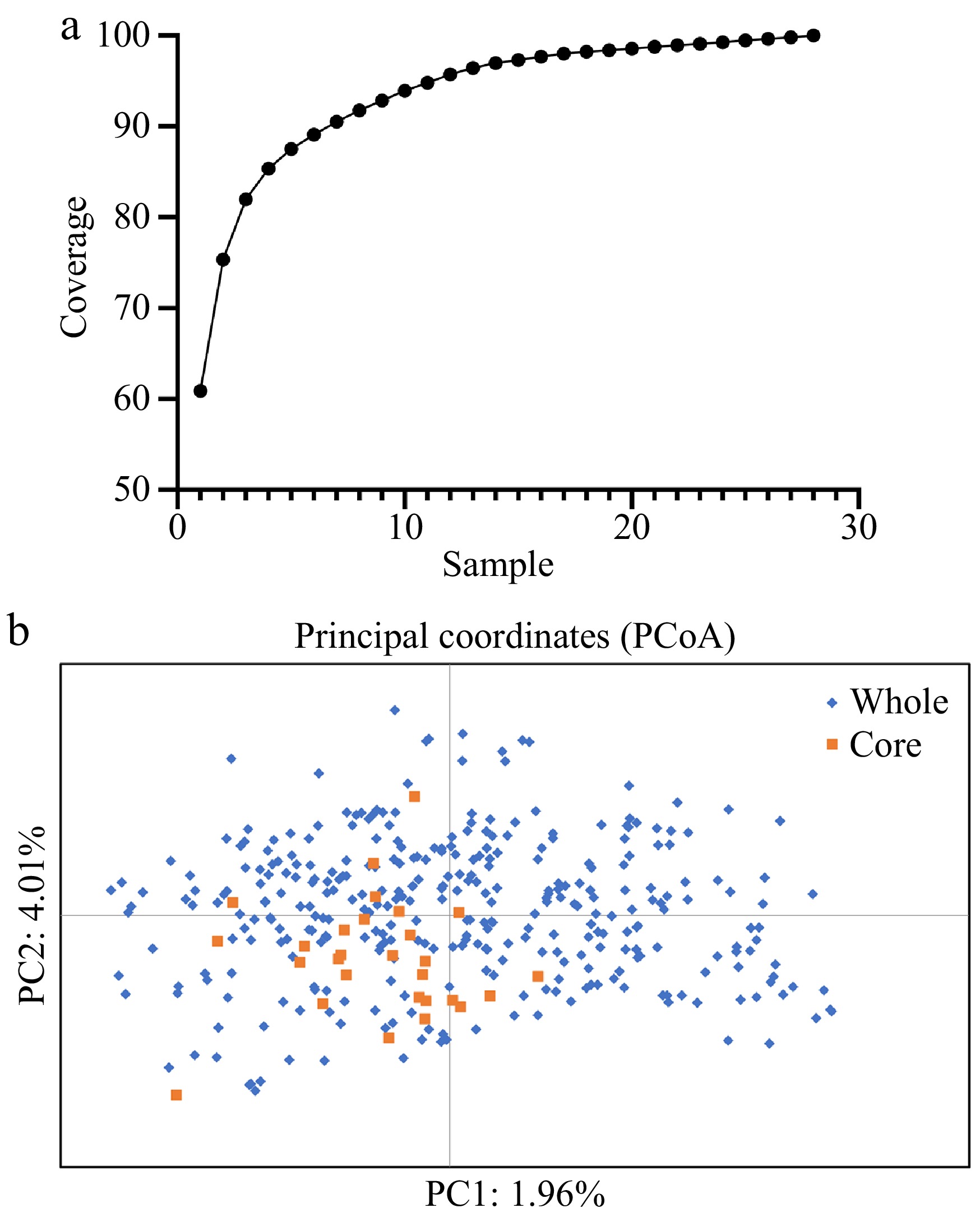 (a) Trends in allele coverage with increasing number of samples. (b) PCoA of the core collection (n = 28) and whole collection (n = 364) were based on genotypic data from SSR markers. The blue represents the variety of whole collection, and the orange represents the core collection.