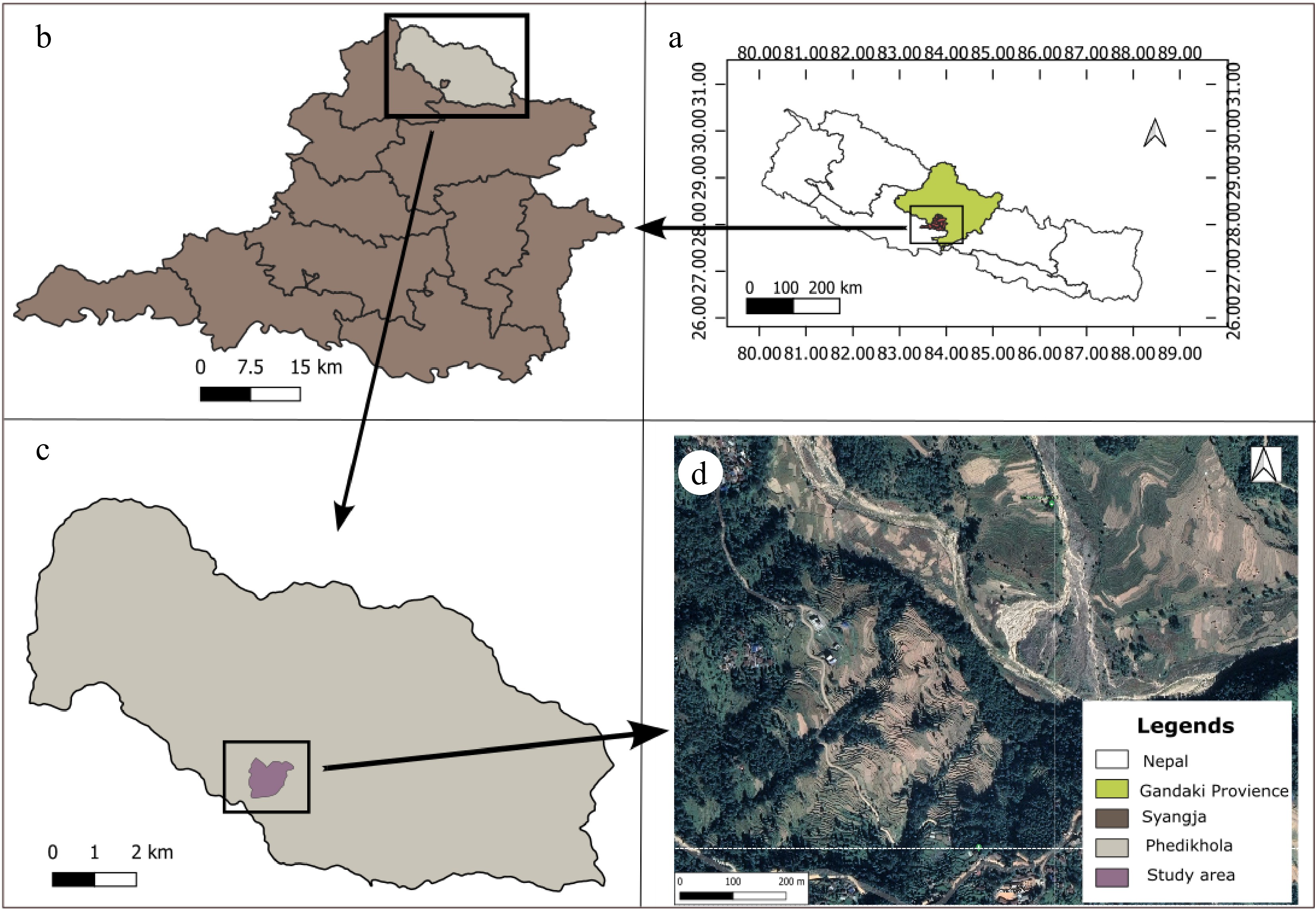 (a) Map of Nepal showing Gandaki Province and Syangja district. (b) Map of Syangja district showing Phedikhola Rural Municipality. (c) Phedikhola Rural Municipality showing Kramdi village. (d) Satellite view of study area (Google hybrid, Qgis, accessed on 12/04/2022).