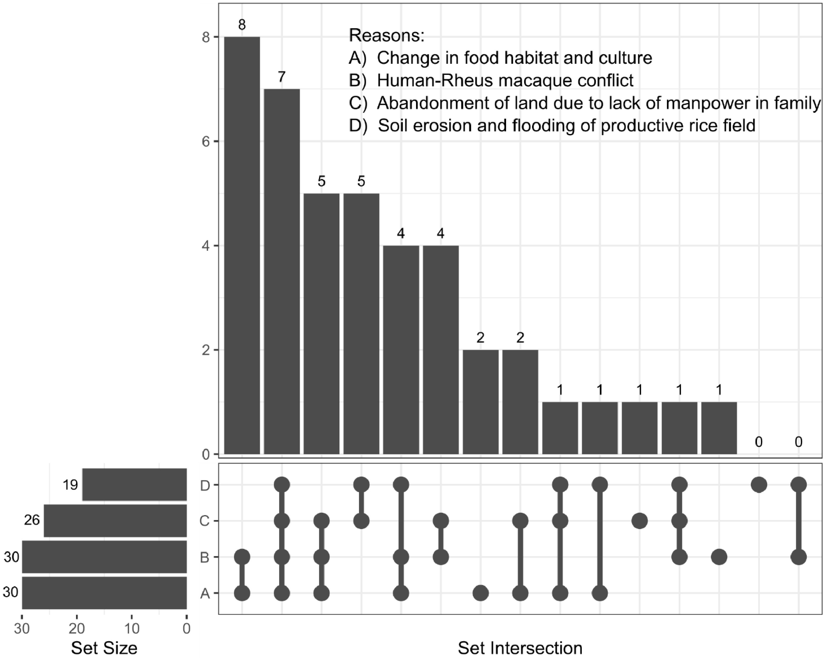 Upset plot depicting the frequency of farmers citing reasons for rice insufficiency in the study area based on their perceptions. Only rice-growing households were surveyed for this question.