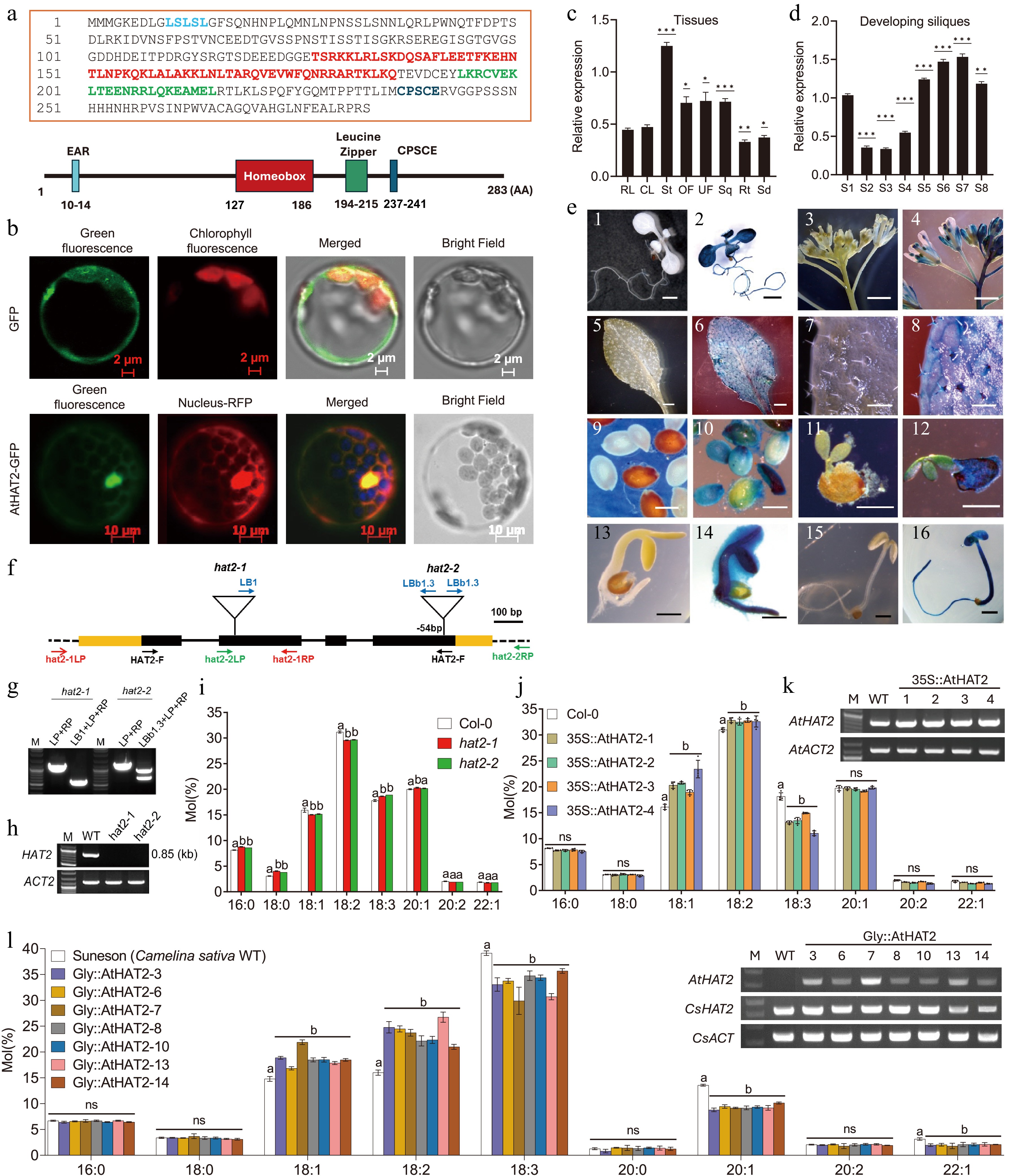 (a) Amino acid sequence and schematic representation of the AtHAT2 protein. Conserved motifs are highlighted: EAR motif (blue), Homeobox domain (red), Leucine zipper (green), and CPSCE motif (navy). (b) Subcellular localization of GFP protein (control) and AtHAT2-GFP fusion protein (AtHAT2 positive) in Arabidopsis protoplasts. Green: GFP, AtHAT2-GFP; Red: chlorophyll auto-fluorescent, nuclear marker NLS-RFP. Scale bar = 2 μm (control); 10 μm (AtHAT2). (c) RT-qPCR analysis of AtHAT2 expression in various tissues: RL, rosette leaf; CL, cauline leaf; St, stem; OF, open flower; UF, unopened flower; Sq, silique; Rt, root; Sd, seedling. Statistical significance was determined by a sample t-test using the RL sample value as the control. (d) Temporal expression pattern of AtHAT2 during seed development. Statistical significance was determined by a sample t-test using the S1 sample value as control. (e) Histochemical GUS staining in AtHAT2::GUS transgenic and wild-type Arabidopsis plants. Tissues: (1), (2) seedling; (3), (4) inflorescence; (5), (6) rosette leaf; (7), (8) trichome; (9), (10) dry seed; (11), (12) seed coat and embryo; (13), (14) 3-day-old dark-grown seedlings; (15), (16) 5-day-old dark-grown seedlings. Scale bars = (1), (2): 0.25 mm; (3)–(6), (15), (16): 1 mm; (7)–(14): 0.5 mm. (f) Gene structure of hat2-1 and hat2-2 T-DNA insertion mutants. Exons (black boxes), introns (yellow boxes), T-DNA insertion sites with respective left borders (LB, LBb1, LBb1.3), and gene-specific primers (hat2-1LP/RP, hat2-2LP/RP) are indicated. (g) Genotyping of hat2 mutants using allele-specific primers. (h) RT-PCR analysis of AtHAT2 expression in wild-type and homozygous hat2 mutants. (i) Fatty acid composition of seeds from wild-type (Col-0) and hat2 T-DNA mutants. (j) Fatty acid composition of seeds from Col-0 and 35S::AtHAT2 overexpressing Arabidopsis lines. (k) RT-PCR analysis of AtHAT2 expression in 35S::AtHAT2 transgenic lines. Line numbers indicate individual transgenic events. AtACT2, the Arabidopsis thaliana ACTIN gene, was used as a control. (l) Fatty acid composition of seeds from wild-type Camelina sativa (cv. Suneson) and AtHAT2 seed-specific overexpression lines (Gly::AtHAT2). (M) RT-PCR analysis of AtHAT2 expression in Gly::AtHAT2 transgenic lines. Line numbers indicate individual transgenic events. CsACT, Camelina sativa ACTIN gene, was used as a control. All data are presented as mean ± SD (n = 3–5 biological replicates). Statistical significance was determined by two-way ANOVA followed by Dunnett’s multiple comparison test (p = 0.05). Groups not sharing the same letter are significantly different; for example, groups labeled 'a' and 'b' differ significantly, while 'a' and 'ab' do not.