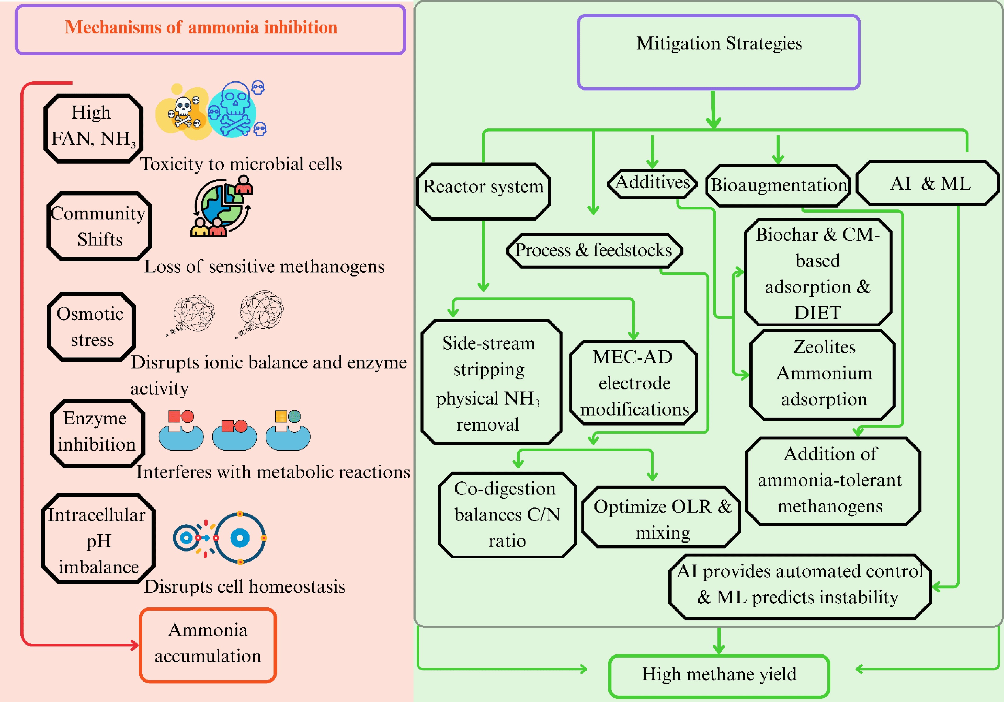 The widely applied chemical and/or physical techniques to reduce ammonia inhibition involve regulating the ammonia concentrations through substrate dilution, carbon-to-nitrogen (C/N) ratio adjustment, pH modulation, and membrane distillation (for ammonia recovery). However, these techniques are difficult to implement, energy-intensive, and costly. Other techniques, such as bioaugmentation and acclimation, the addition of different supportive materials such as biochar, activated carbon, and magnetite, as well as the provision of trace elements and nanobubble water, have been tried to enhance biological processes[5]. Commercial AD systems are increasingly being monitored using automated monitoring and control techniques. Real-time monitoring of parameters such as ammonia levels, pH, volatile fatty acids (VFA) concentration, and methane output allows for quick modifications before significant inhibition takes place. By thoroughly examining the primary inhibitory indicators and facilitating prompt automated responses when the system exhibits indications of instability, artificial intelligence (AI), and machine learning (ML) can improve bioreactor monitoring[6]. This review describes current advancements in ammonia inhibition mitigation techniques in light of these breakthroughs.