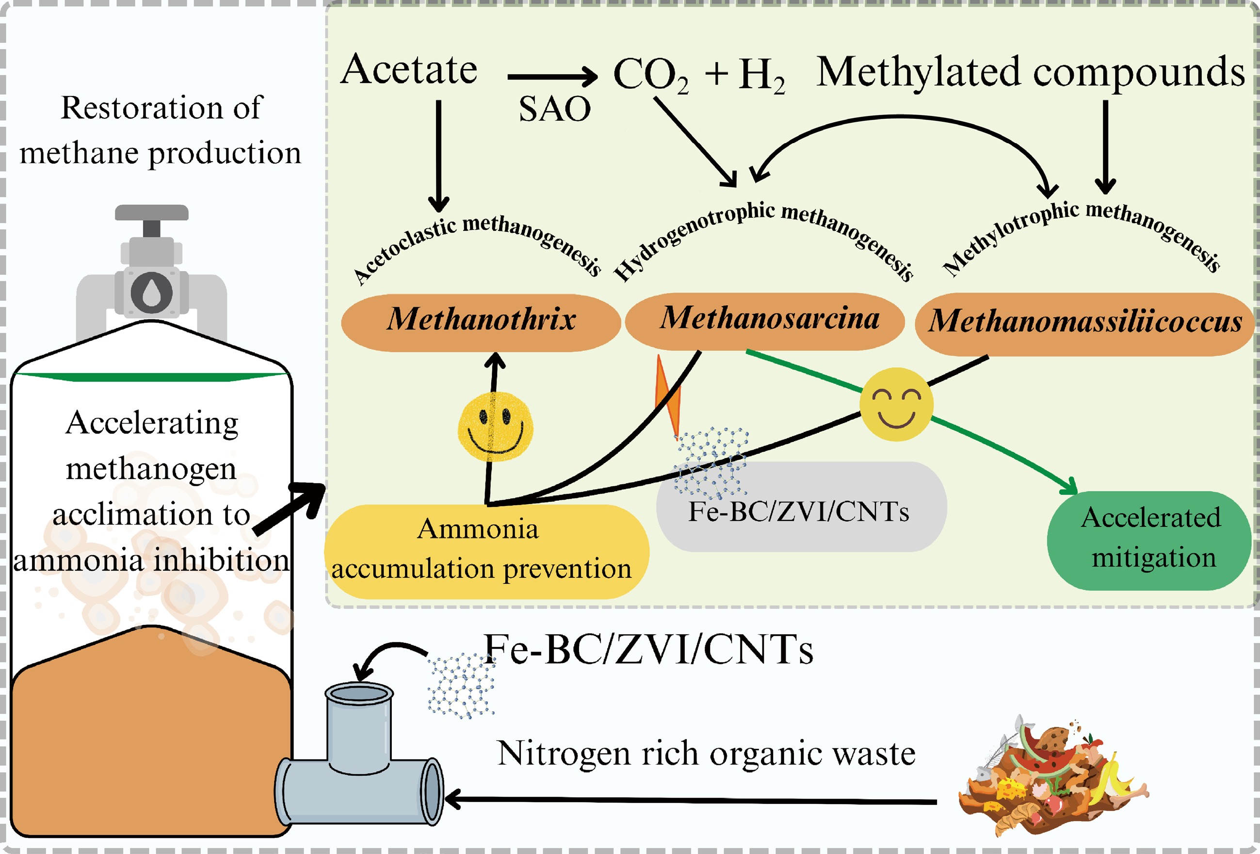 Anaerobic digestion (AD) is an attractive waste treatment method that can achieve waste management while recovering energy. It has other significant benefits, such as less sludge generation and the use of waste organic matter, and it helps offset the use of fossil fuels[1]. Nitrogen-rich wastes are suitable as AD substrates; however, they are frequently prone to low methane output, process instability, and occasionally total collapse, especially because of ammonia toxicity[2]. Ammonia nitrogen can surpass a threshold during the degradation of organic matter and become toxic to AD microbes, even though it supports their development at specific lower amounts. In particular, the microorganisms have no detrimental effects at 200–1,000 mg/L, but they are impacted at 1,500–3,000 mg/L ammonia concentrations, particularly in high pH anaerobic settings[3]. Furthermore, under all pH conditions, AD microbes are inhibited at varied levels when ammonia nitrogen levels surpass 3,000 mg/L. Methanogens are particularly sensitive to free ammonia nitrogen (FAN) due to the absence of peptidoglycan in their cell walls, which allows diffusion of FAN through the plasma membrane. Inside the cell, FAN disrupts the ionic balance, causes excessive uptake of K+, and affects the uptake and synthesis of osmoprotectants, and all of these occur at the expenditure of ATP. Metabolically incapacitated methanogens are unable to catabolize VFAs and hydrogen, leading to system inhibition via lowering of pH and an increase in hydrogen partial pressure[4]. Hence, it can be surmised that the primary reason for the collapse of AD due to ammonia accumulation is essentially the result of ammonia toxicity to methanogens.